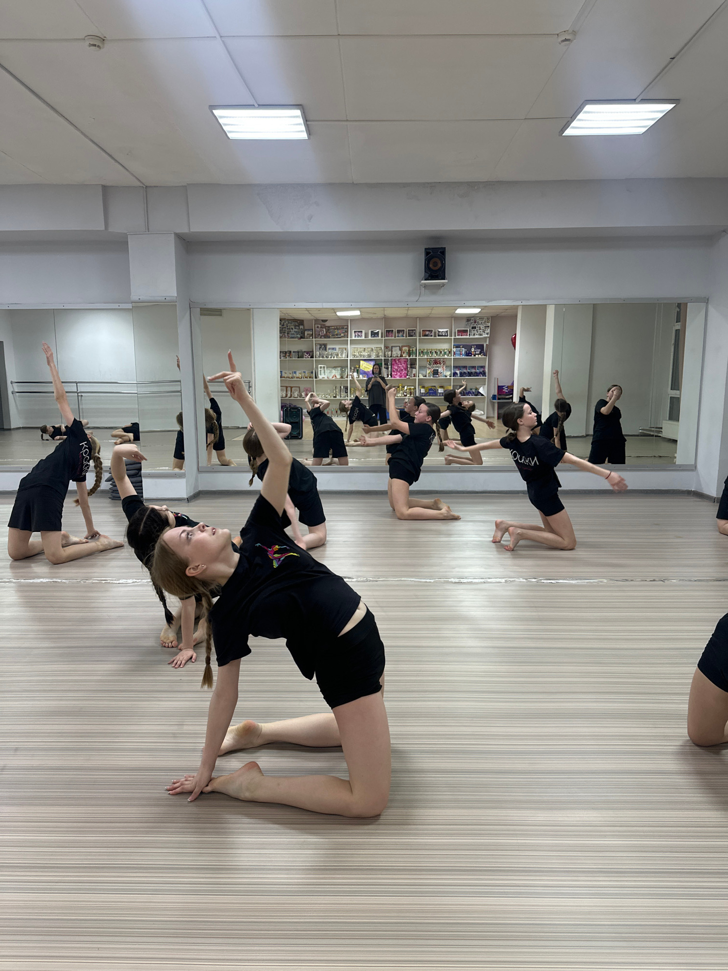A dance class is in session in a studio in Votkinsk, Russia. Several young women wearing black shorts and t-shirts are performing a dance pose, bending backwards with one arm raised. The room has a li…read more