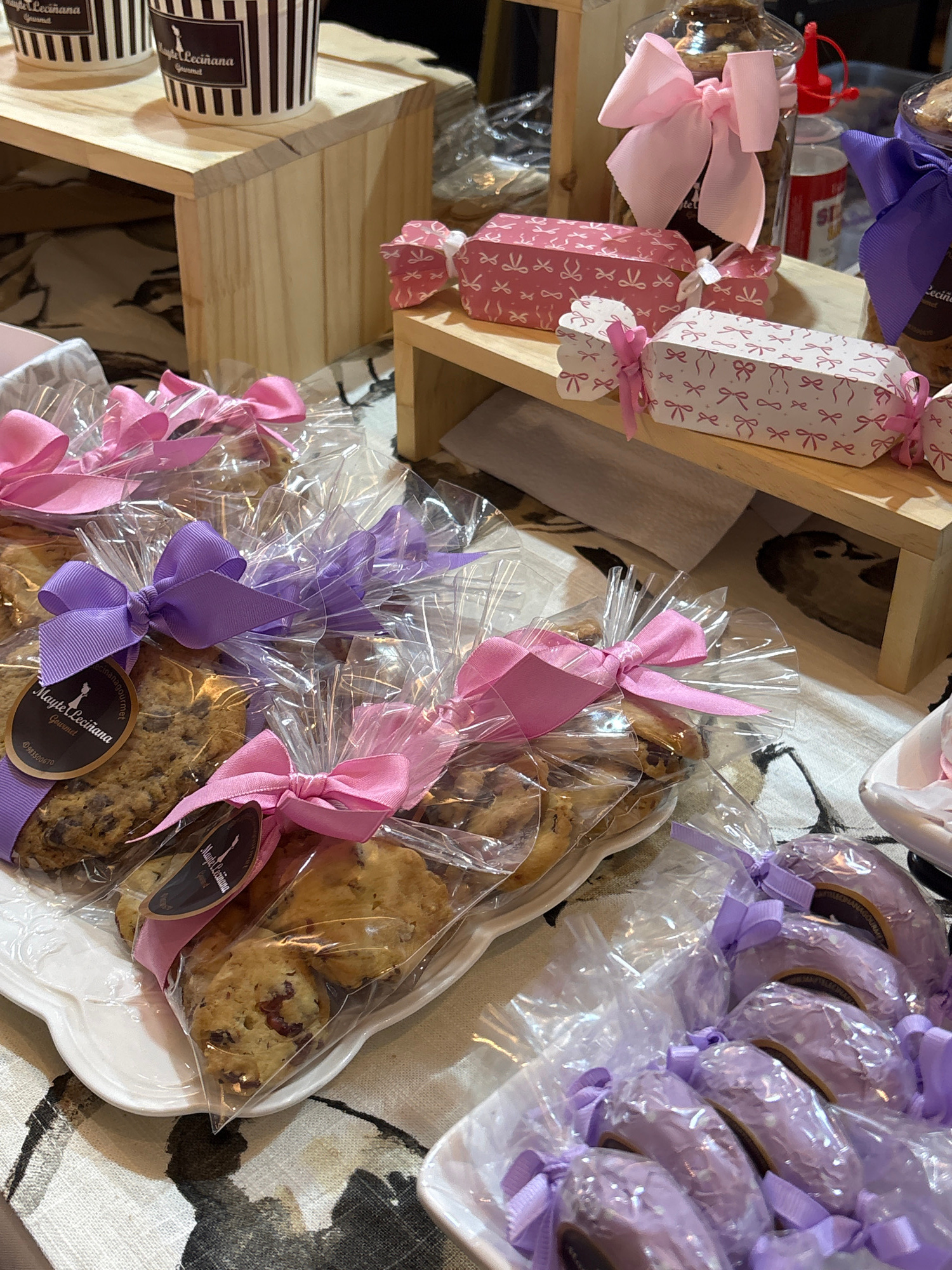 The image shows a display of packaged baked goods, likely for sale. There are cookies wrapped in clear cellophane bags and tied with pink and purple ribbons. Also visible are smaller, pastel-colored p…read more