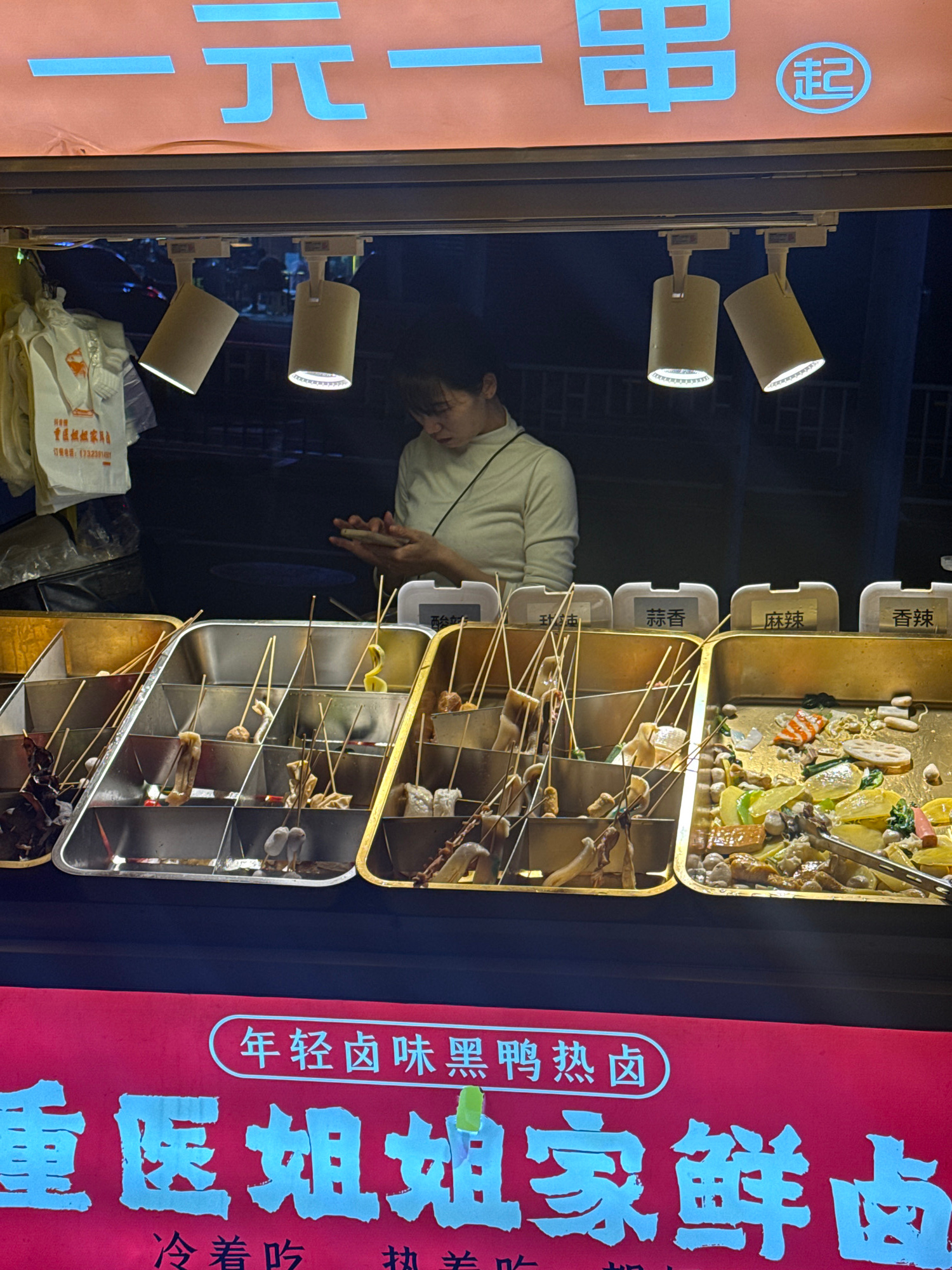 Here is a detailed description of the image: **Setting and Environment:** The image appears to be taken at a street food stall, presumably at night, in the Yuzhong District, China. The lighting is a…read more