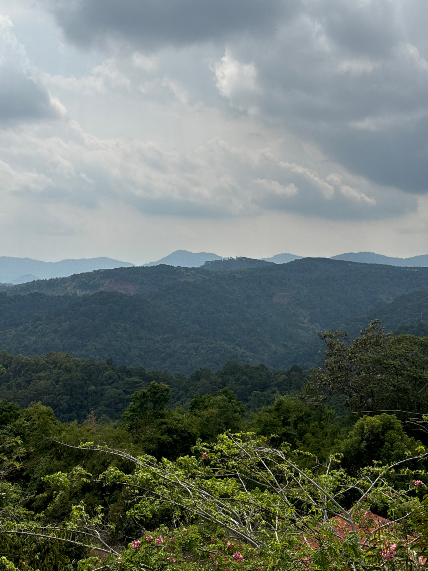 This landscape image, likely taken in Sơn Điền, Vietnam, captures a serene mountainous vista under a cloudy sky. The scene is dominated by layers of forested mountains receding into the distance, crea…read more