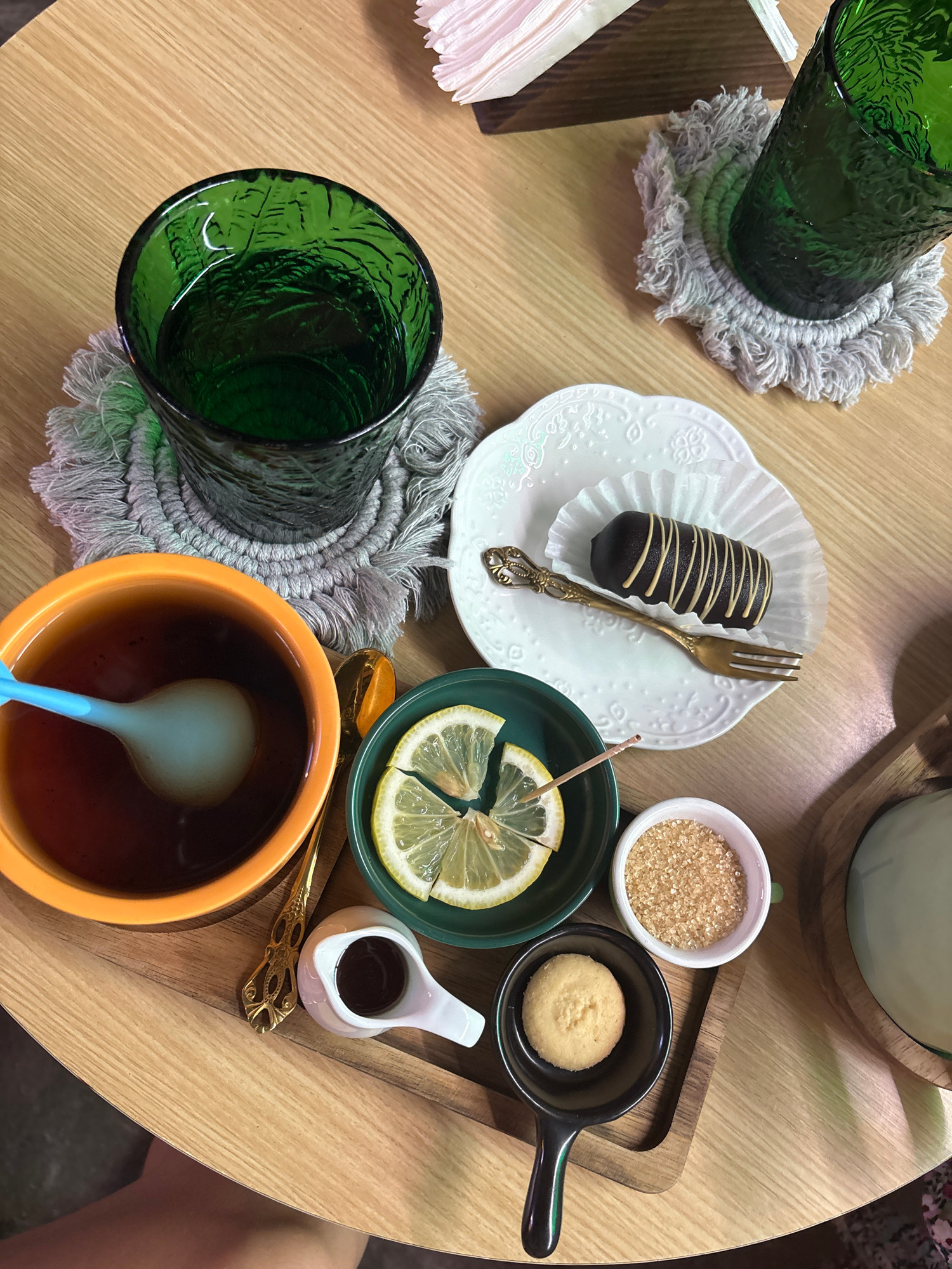 The image presents a top-down view of a table setting, likely in a café or restaurant, featuring a selection of beverages and a dessert. The table is made of light-colored wood. There are two texture…read more