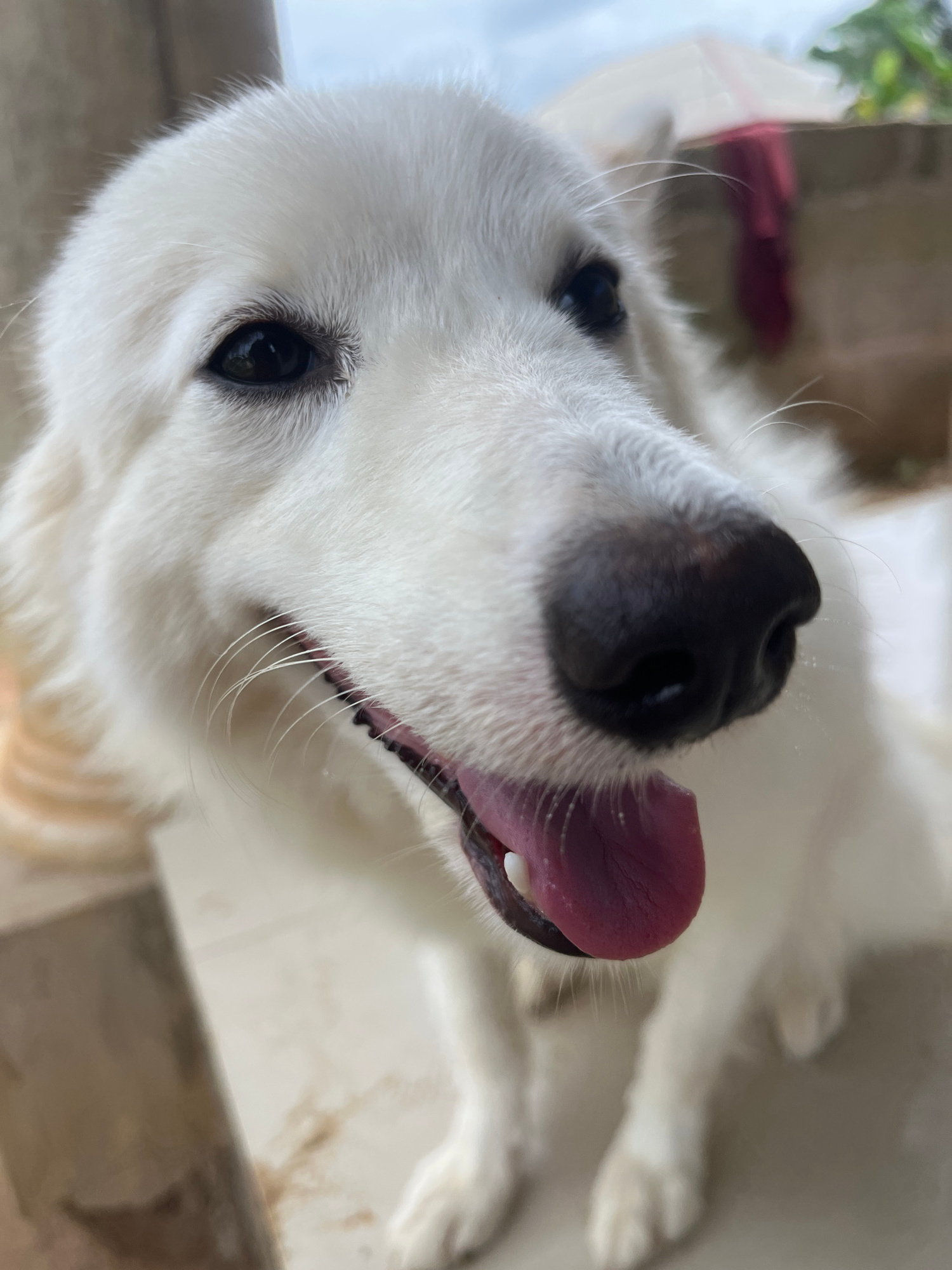The image features a close-up view of a white dog, possibly a Great Pyrenees, with its tongue sticking out. The dog's face is the primary focus, with its black nose and one visible eye. The dog's fur…read more