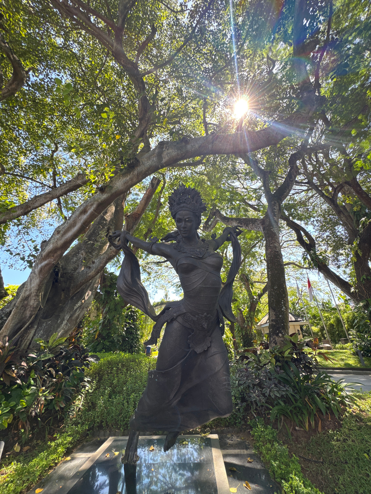 The image depicts a statue in Kuta Selatan, Indonesia. The statue appears to be bronze or a dark metal, depicting a woman in traditional dress with flowing fabric. The statue is positioned amongst a l…read more
