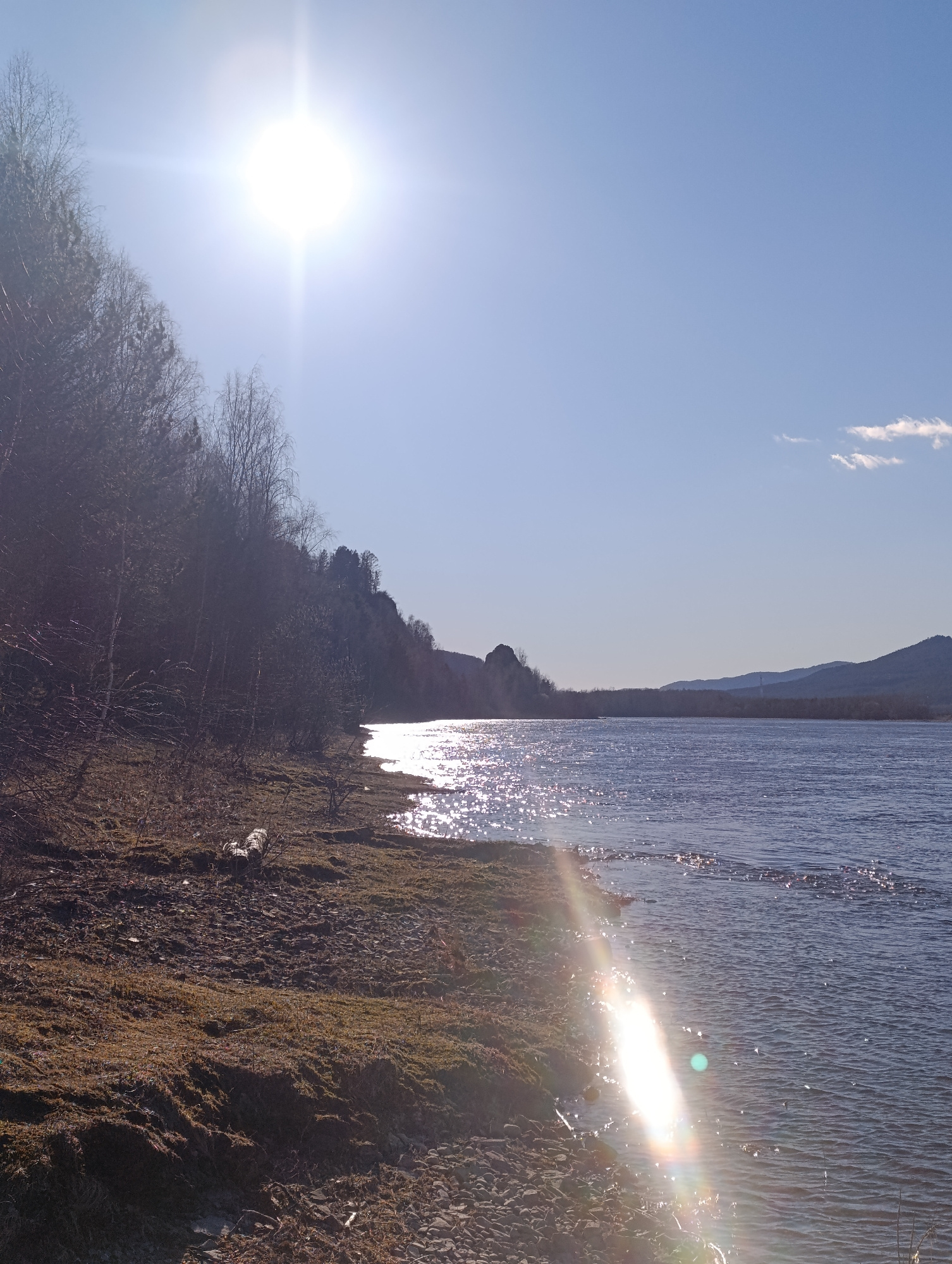 The image shows a riverbank in Krasnoyarsk, Russia, under a bright sun. The river reflects sunlight, causing a shimmering effect on the water's surface. A rocky and mossy shoreline leads to a wooded area on the left, contrasting with the open water on the right. Mountains are visible in the distance across the river. The sky is clear blue, with one small cloud. A fallen tree trunk is visible on the shore. | Open Wire