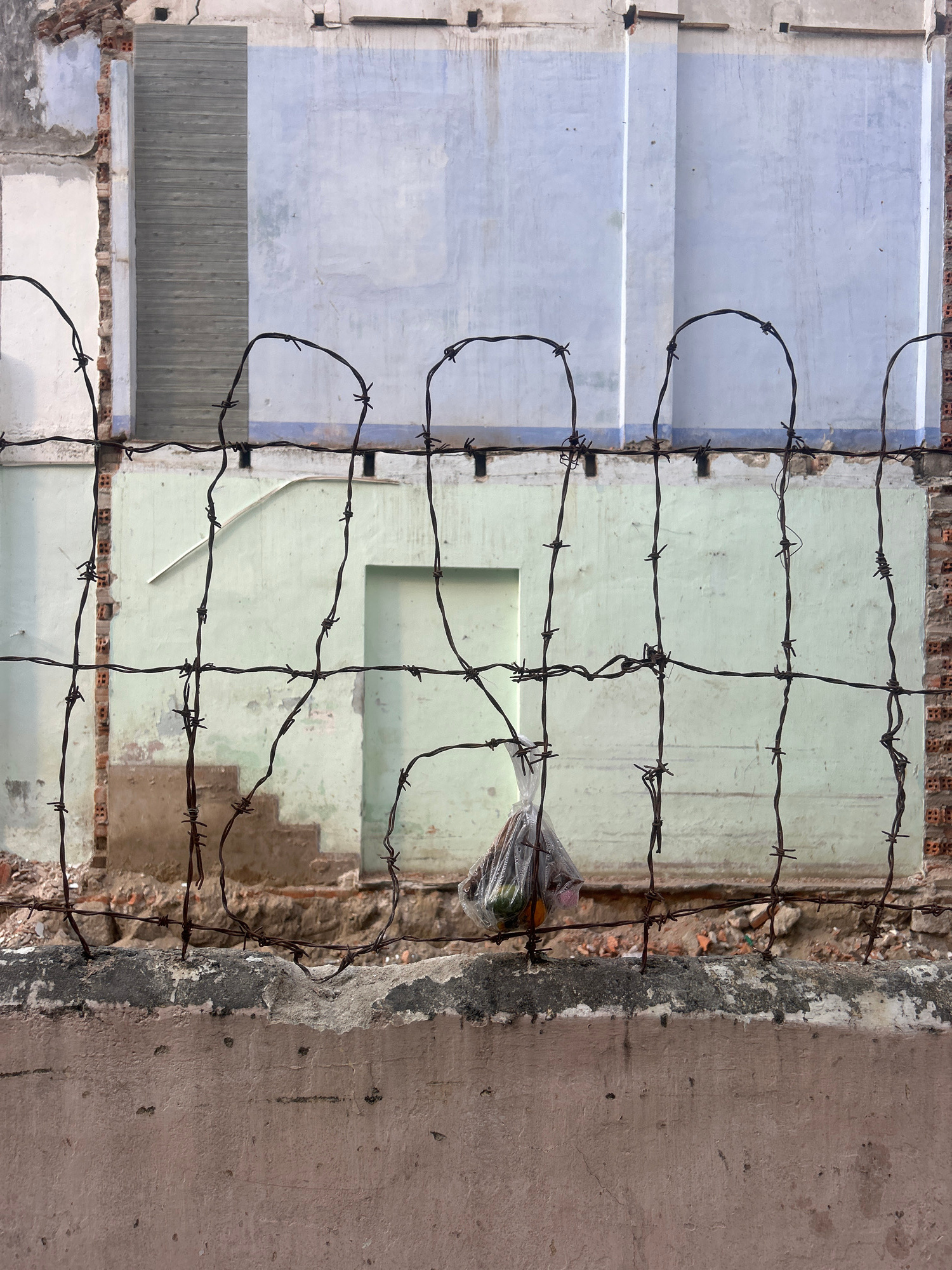 The image depicts a dilapidated building in Nha Trang, Vietnam, partially obscured by a makeshift barbed wire fence. The building's facade is a patchwork of pale blue and green sections, revealing bri…read more