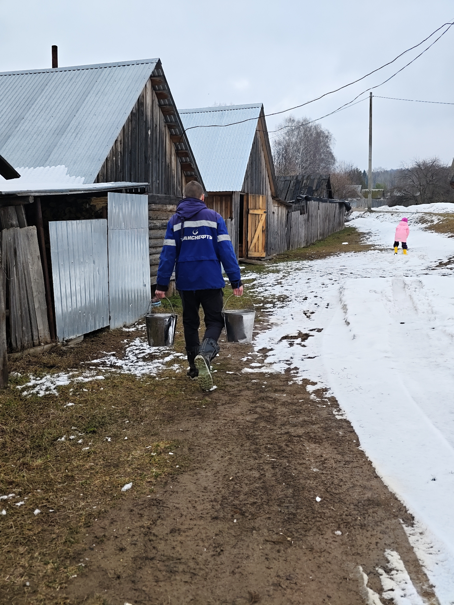 The scene is a rural setting in Уральское, Russia. A man wearing a blue and black jacket with "ТАНЕЧЕРФТЬ" written on the back, dark trousers, and boots, is carrying two silver buckets, one in each ha…read more