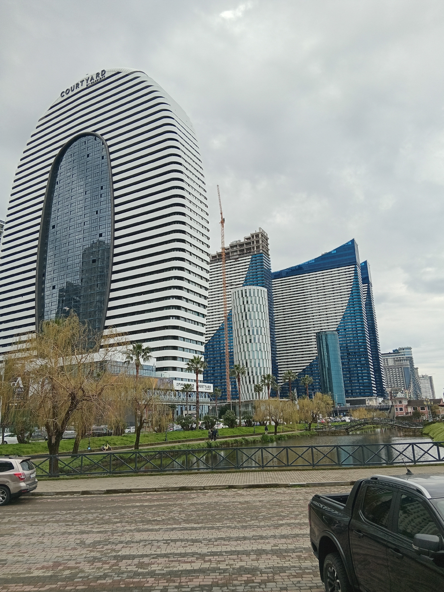 The image depicts a cityscape in Batumi, Georgia, under a cloudy sky. Prominently featured is the architectural landmark of the Courtyard by Marriott hotel, characterized by its distinctive white and…read more