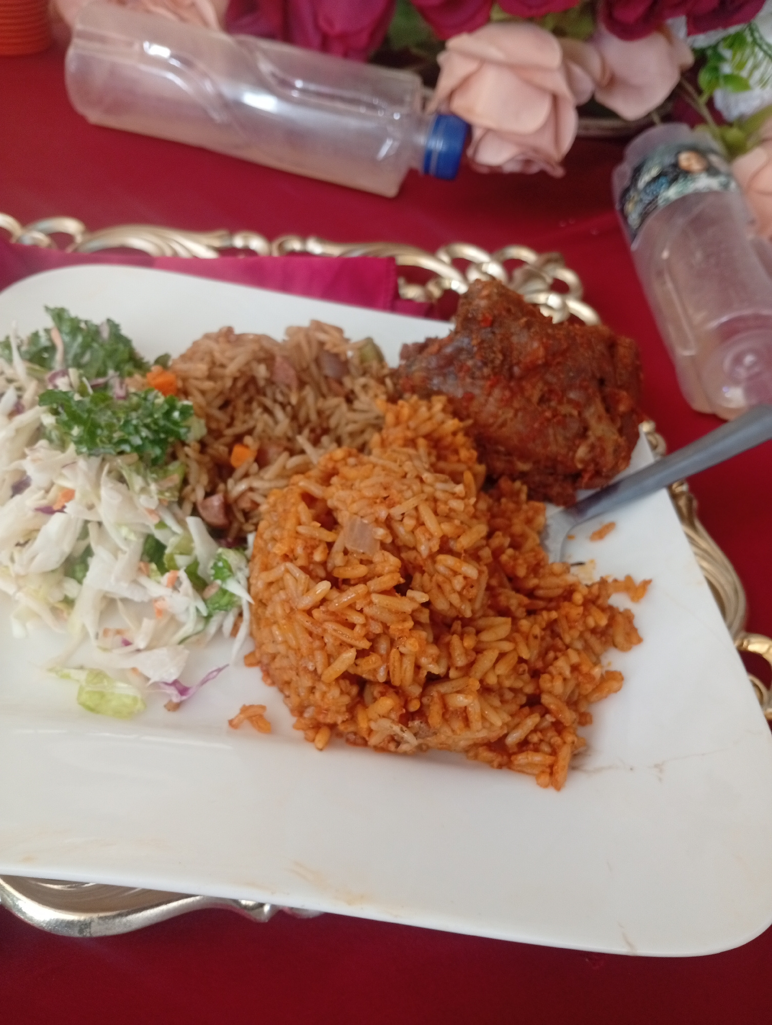 A close-up shot shows a white plate laden with Nigerian food. The plate is garnished with a gold-colored, ornate rim. Three distinct dishes are present: Jollof rice, fried rice, and coleslaw. A piece…read more