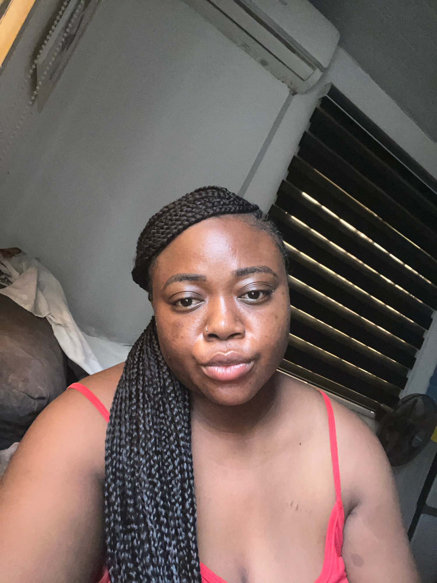 The image features a person with dark skin, wearing braids and a red top. The person is looking at the camera. The background includes a window with blinds and an air conditioning unit. The location iā¦read more