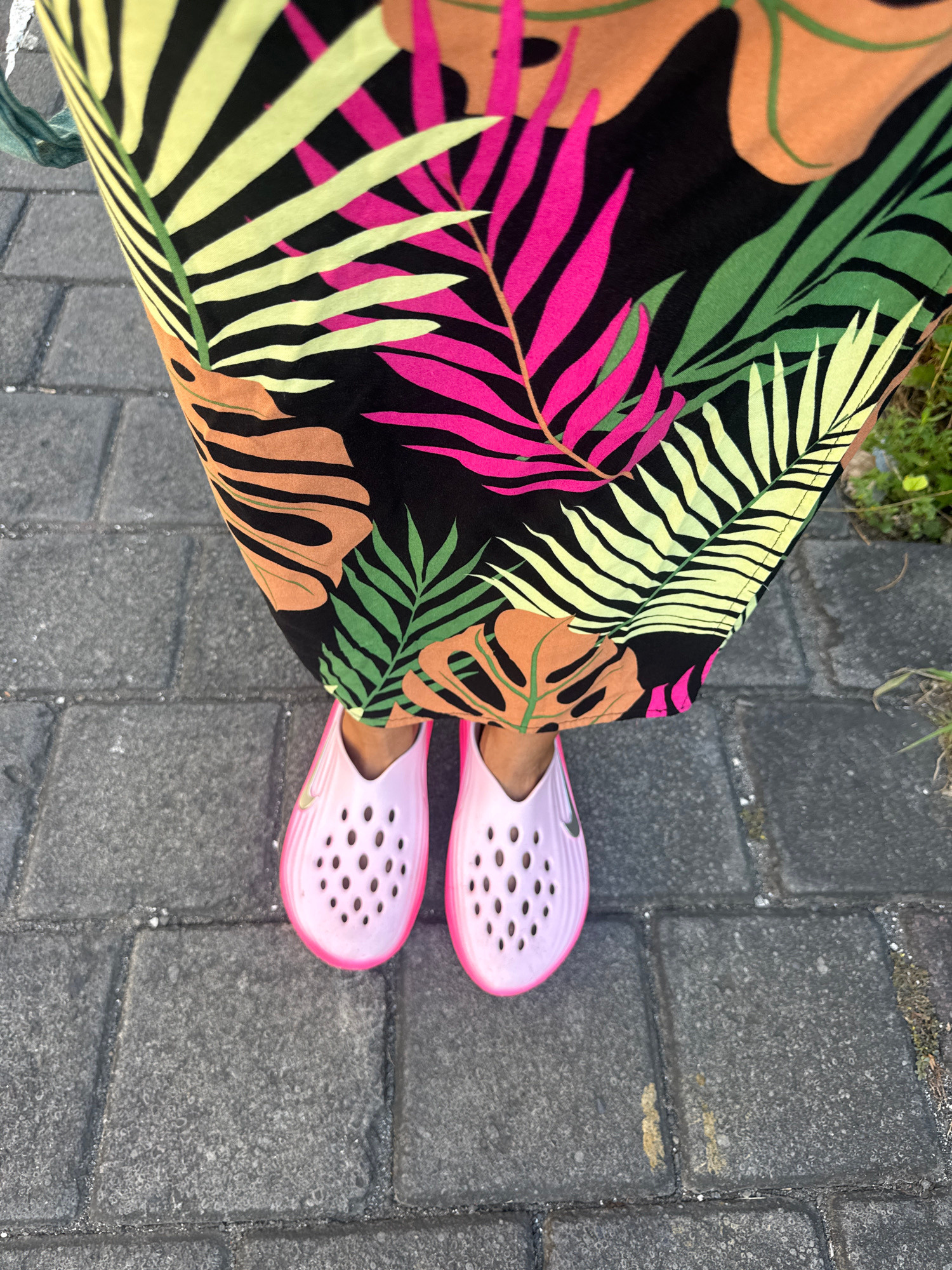 This image, taken in Kuta, Indonesia, presents a top-down view of a person's lower body, focusing on their feet and a brightly patterned garment. The individual is wearing light pink slip-on clogs, si…read more