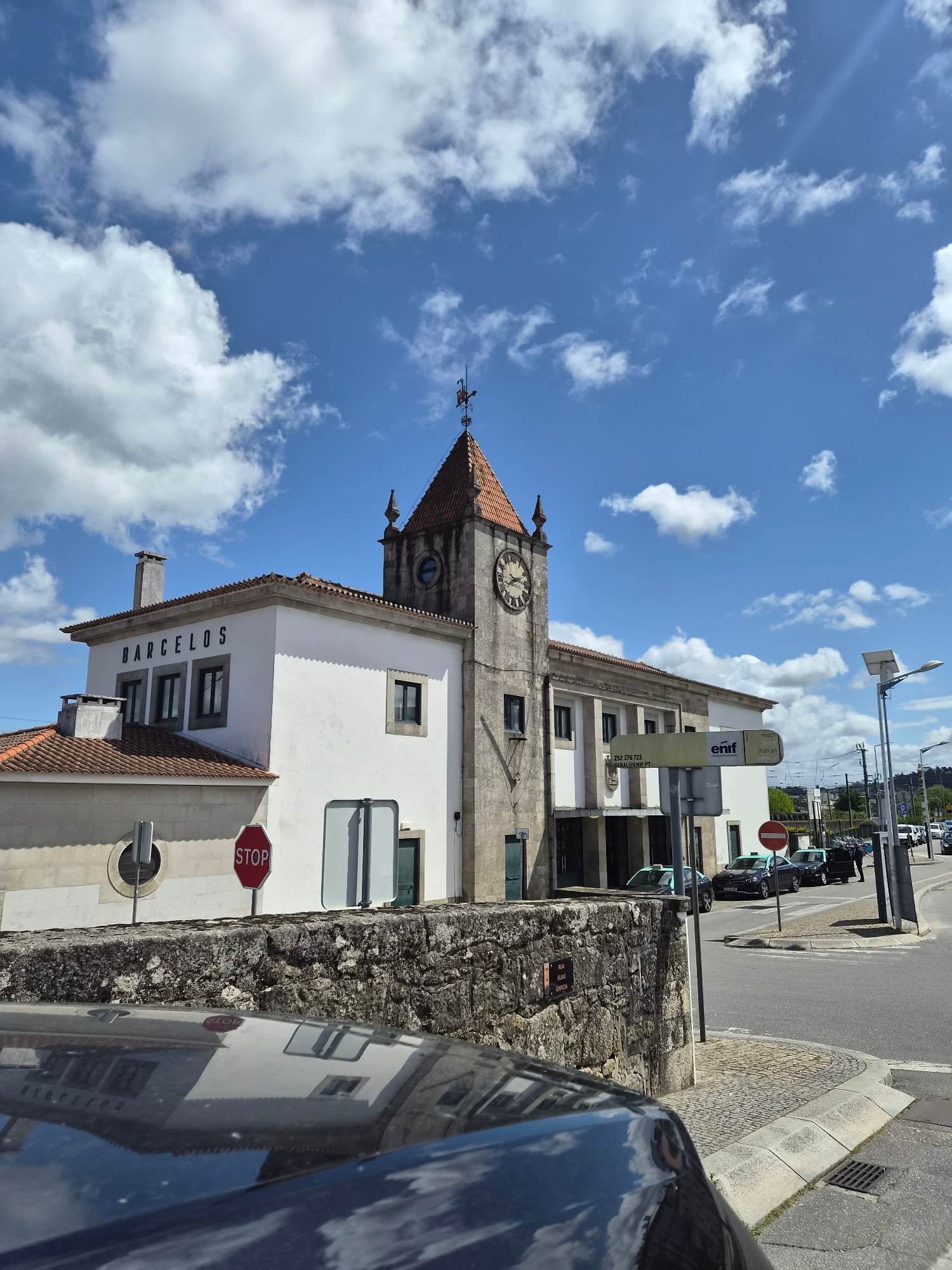 The image depicts a street scene in Barcelos, Portugal. Prominently featured is a building with the word "BARCELOS" inscribed vertically on its facade. The building has a clock tower. The sky is blue…read more