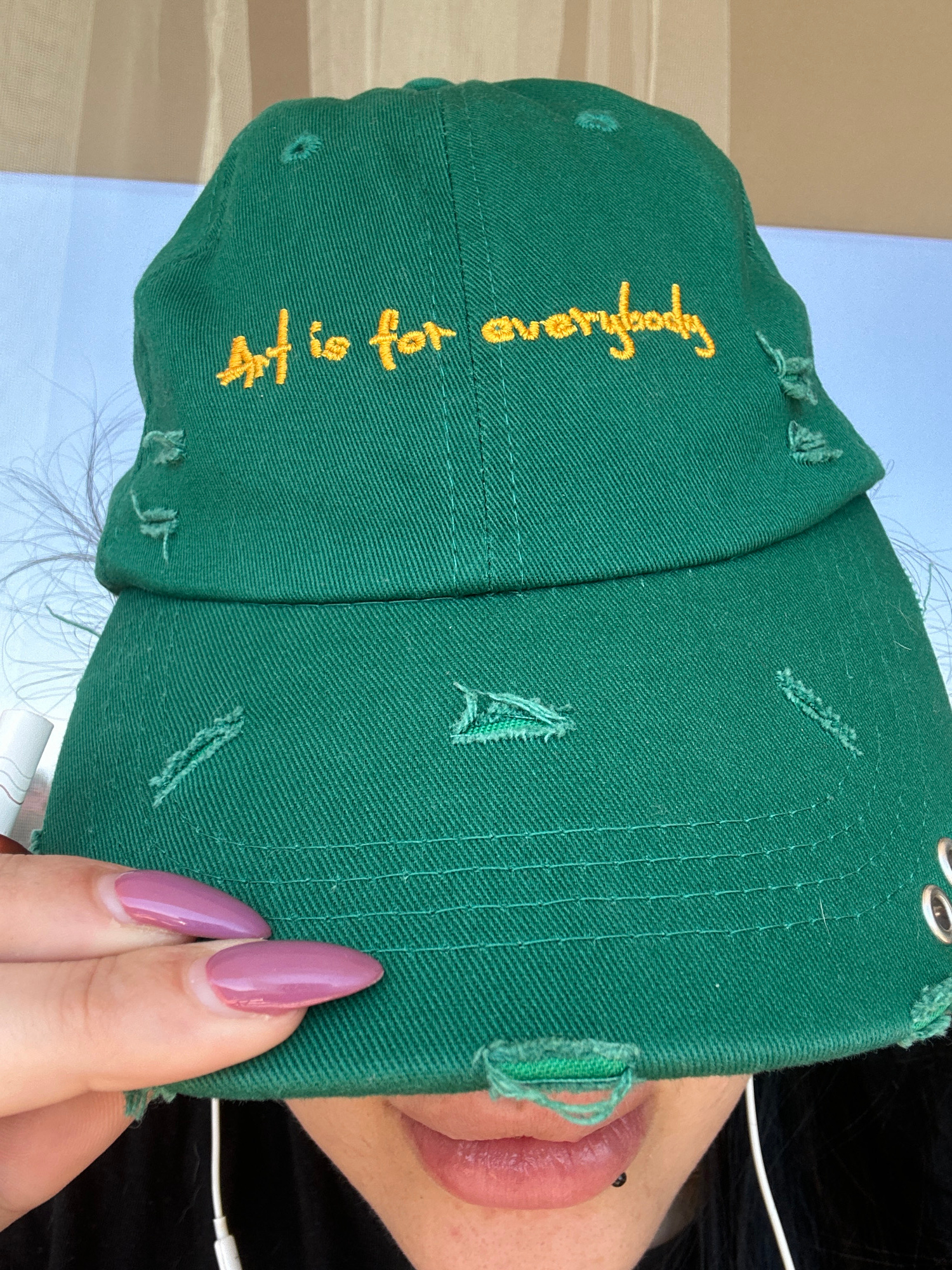 The image depicts a person holding a distressed green baseball cap with the text "Art is for everybody" embroidered in yellow. The cap is close to the person's face, with a portion of their lip and a…read more