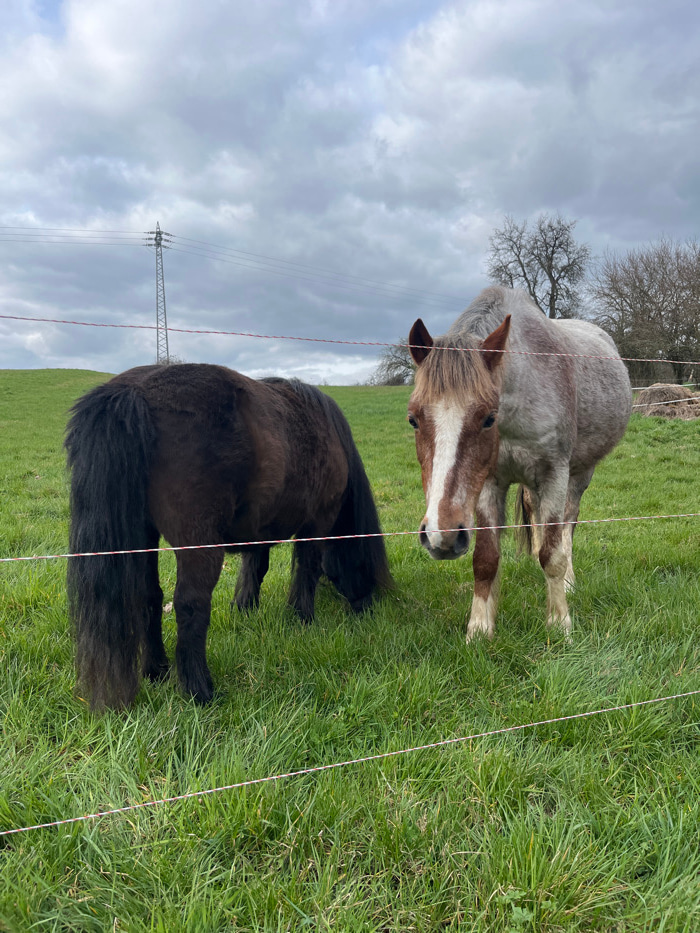 This image captures a pastoral scene in Gangloff, Germany, featuring two horses within a fenced, grassy field under an overcast sky. In the foreground, two horizontal strands of a white and red strip…read more