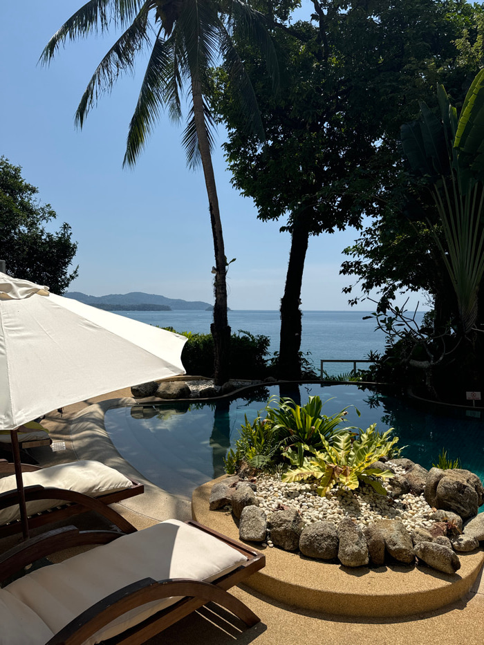 A tranquil scene with tropical foliage frames a glimpse of the ocean. A palm tree leans in from the left, contrasting with a taller tree in the center. To the right, a decorative stone border with pla…read more