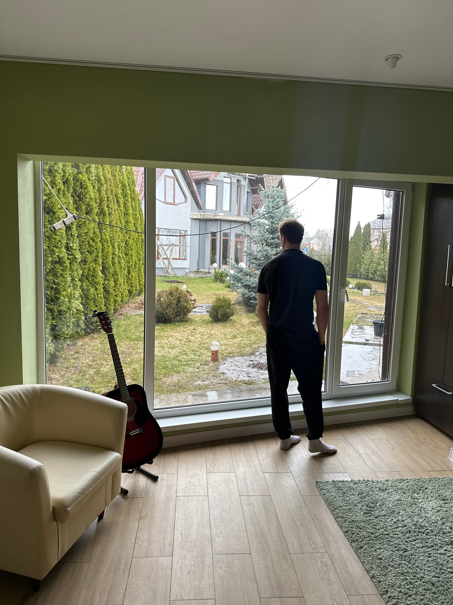 A man in a black t-shirt and black pants stands in front of a large window, his back to the camera. He is wearing white socks. He appears to be looking out at a green lawn and houses. Outside, the gro…read more