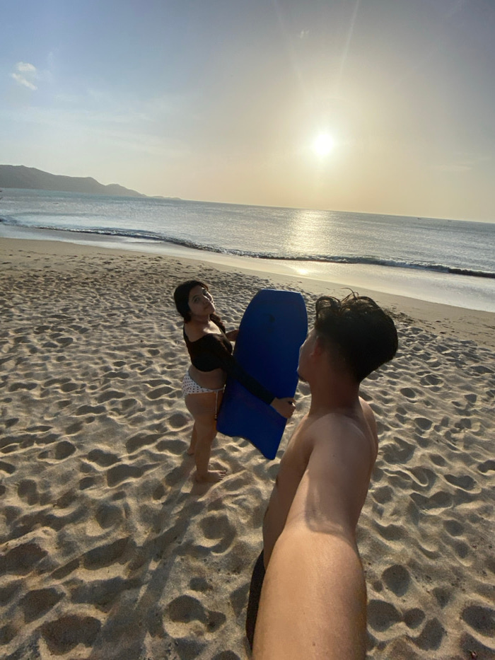 The image depicts two individuals on a sandy beach at what appears to be sunset or sunrise in Juan Griego, Venezuela. A female subject stands on the left, facing partially towards the camera. She wear…read more