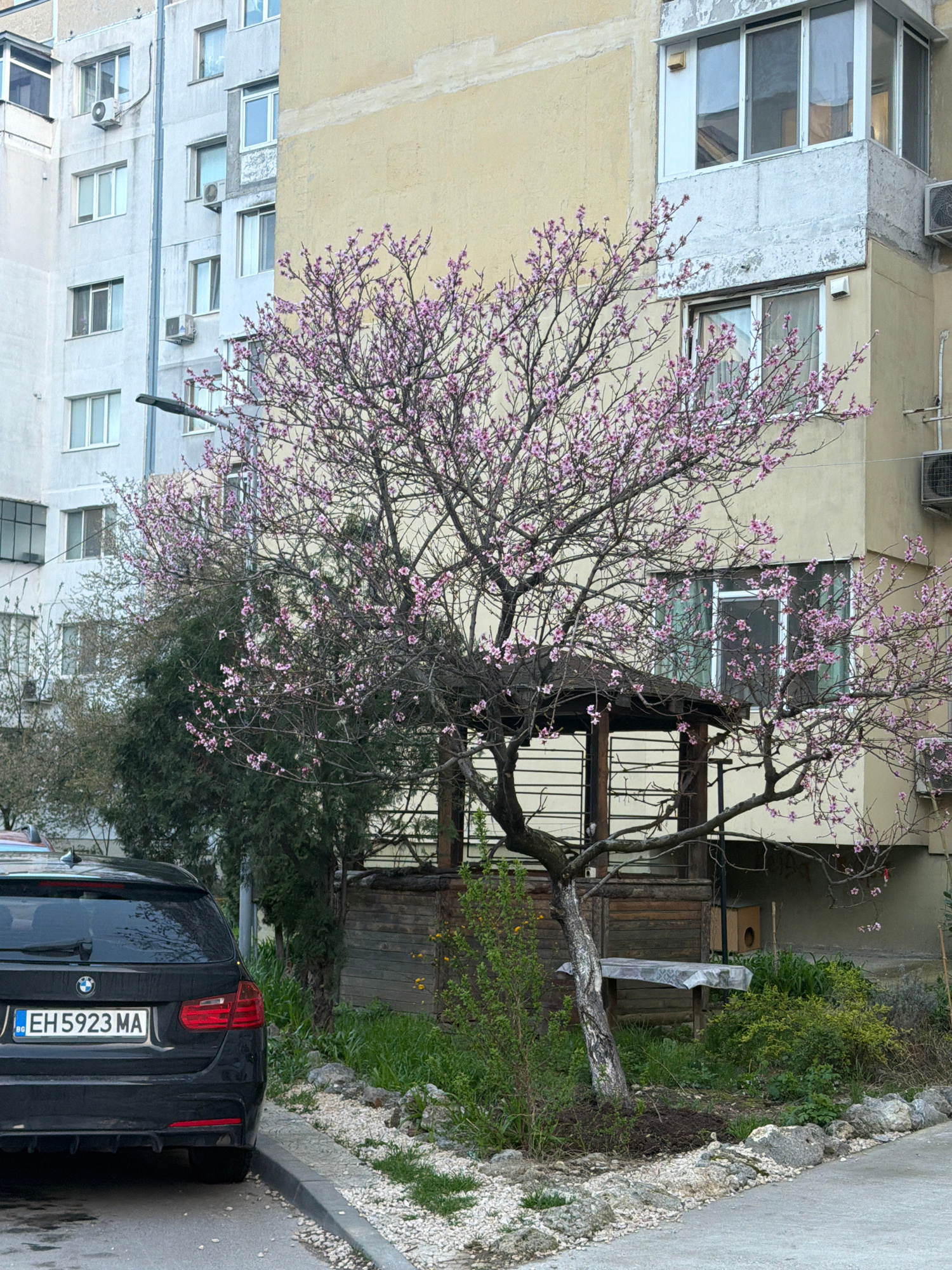 The image depicts an urban scene in Varna, Bulgaria, with a flowering tree as a central element. The tree, possibly a cherry or plum, exhibits numerous pink blossoms, indicating spring. Behind the tre…read more