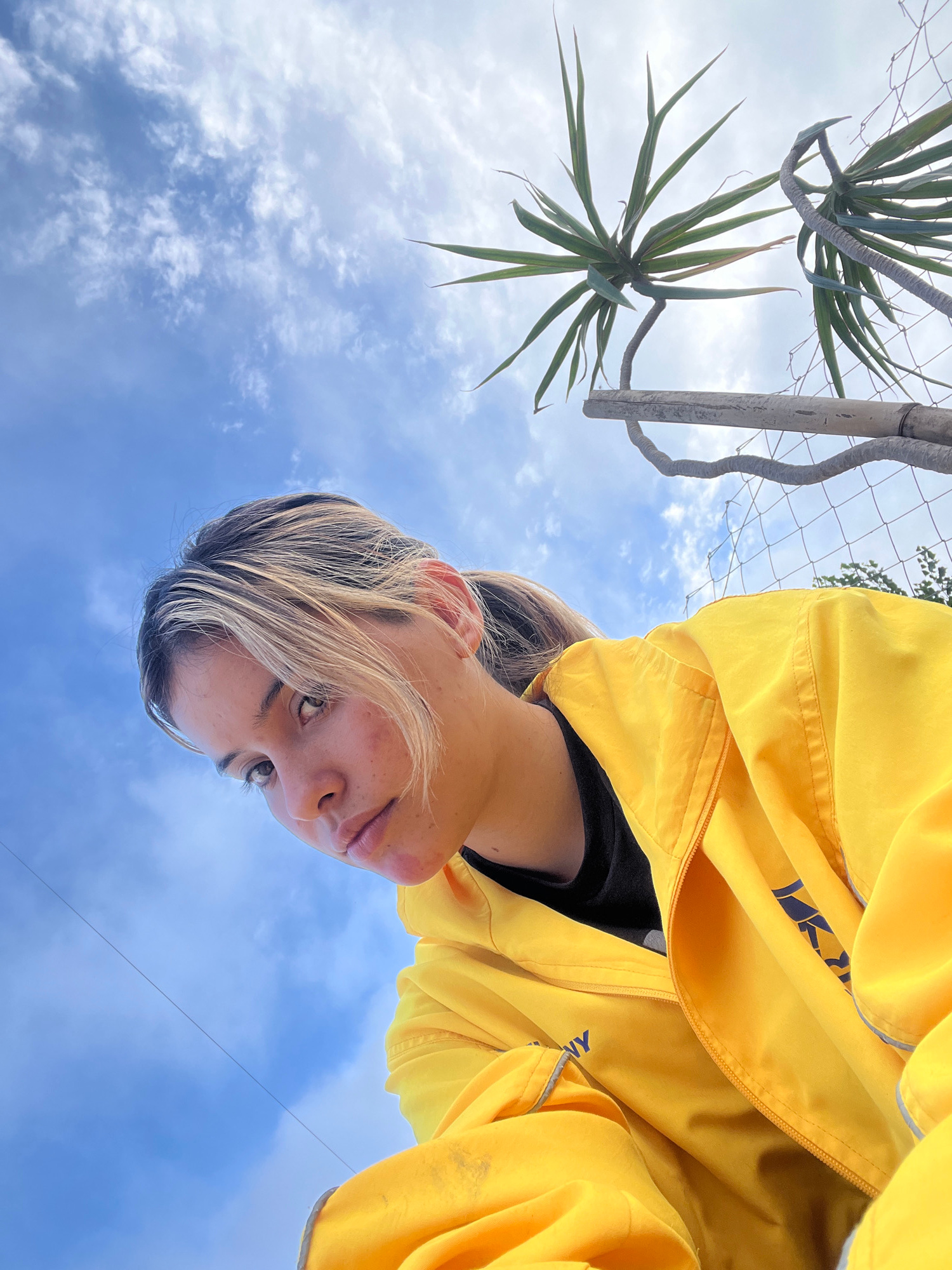 An upward-tilted photograph features a person with light skin, light brown hair, and wearing a yellow jacket, positioned against a backdrop of a partly cloudy blue sky. Above the person's head, there'…read more