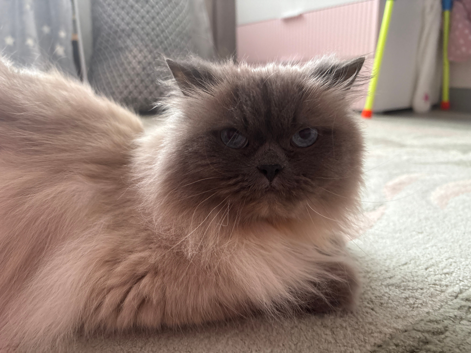 A medium shot depicts a Ragdoll cat with blue eyes. The cat is positioned upside down in the frame, with its face centered. The background includes a gray rug in the upper portion of the image and, in…read more