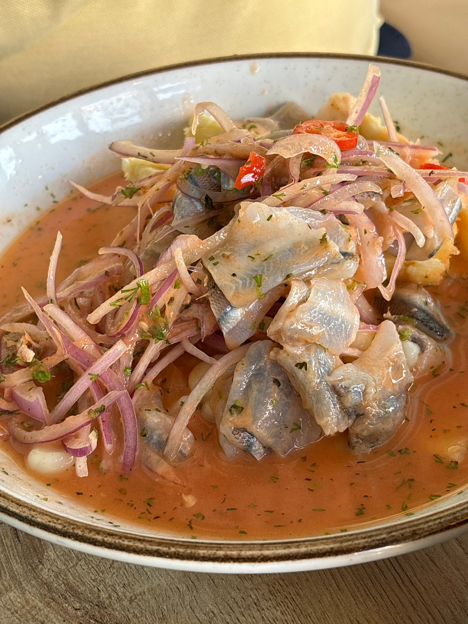 A close-up overhead shot depicts a dish of ceviche served in a cream-colored, speckled bowl with a tan rim. The ceviche is composed of pieces of light gray fish, thinly sliced red onions, small bits o…read more