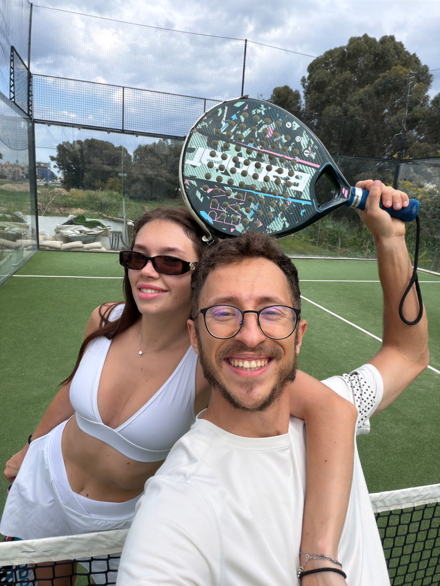 A couple is posing for a selfie on a padel court in Larnaca, Cyprus. The man, wearing glasses and a white athletic shirt, holds a black padel racket above his head with his right hand. The woman, wearβ¦read more