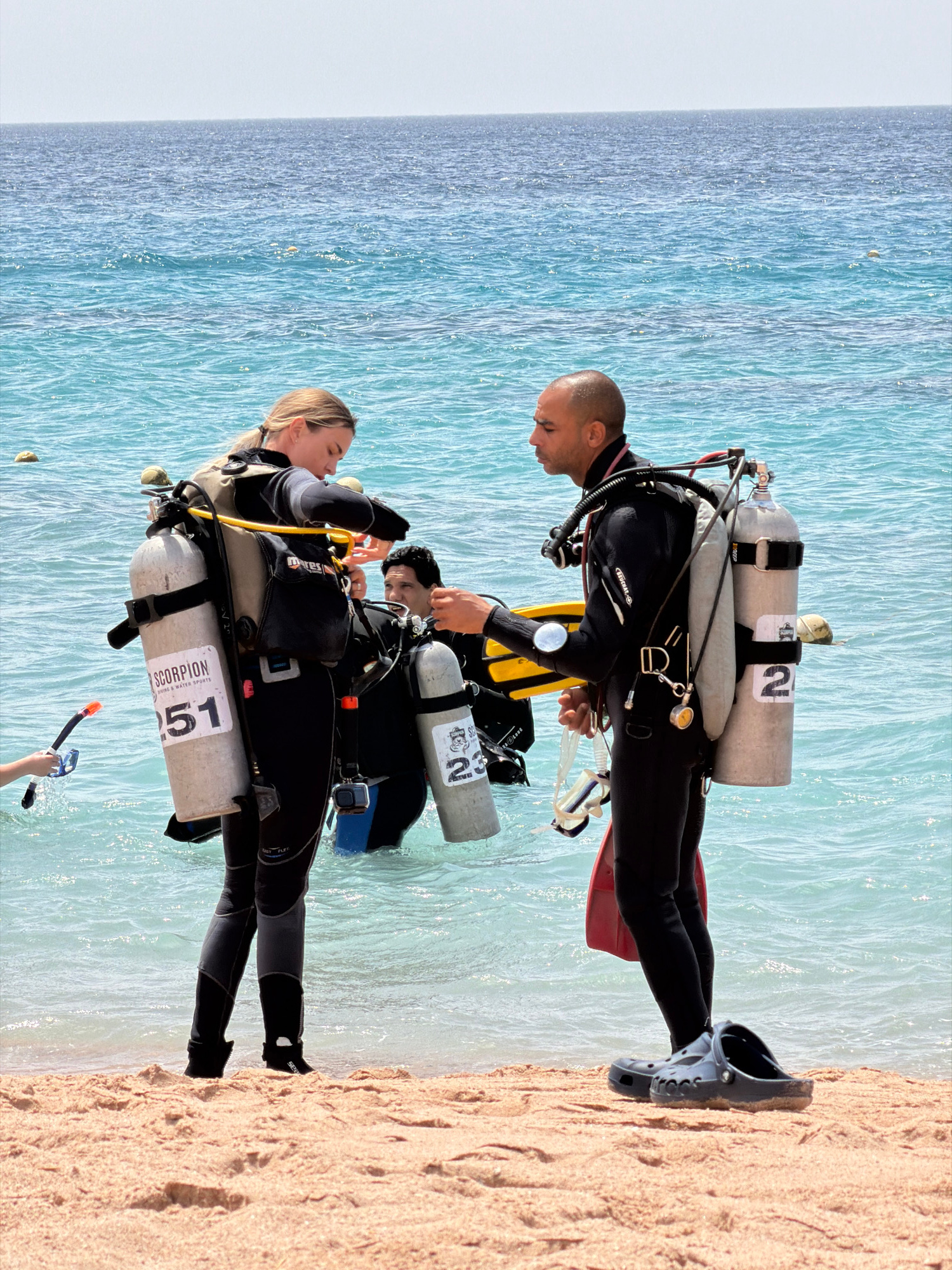 Two divers, a male and a female, stand in the shallow water near a sandy beach on the edge of the Red Sea in Sharm El Sheikh, Egypt. The male diver is bald and is wearing a black wetsuit, flippers, an…read more