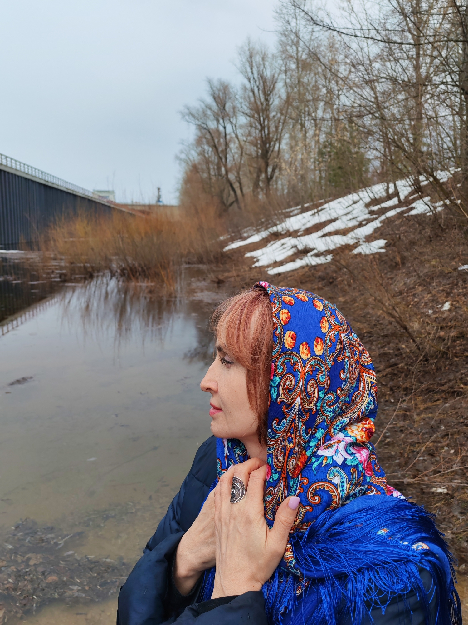 A woman stands near a body of water in what appears to be a natural setting within an urban environment. The location is Chaikovsky, Russia. The woman is wearing a blue patterned headscarf (Pavlovo Po…read more