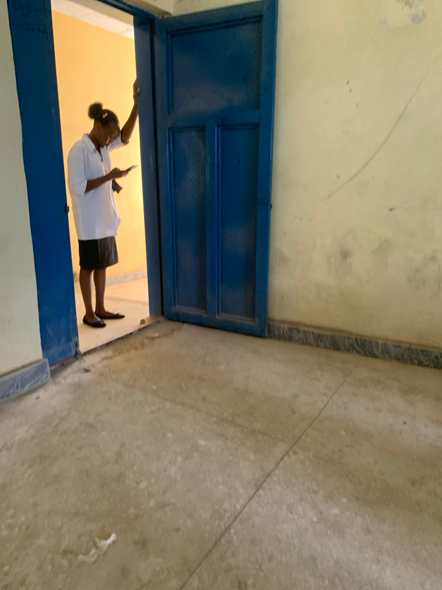 A medium-shot image shows a young person wearing a white top and dark skirt walking through a blue doorframe into a yellow-walled room. The person is holding what appears to be a phone in their right…read more