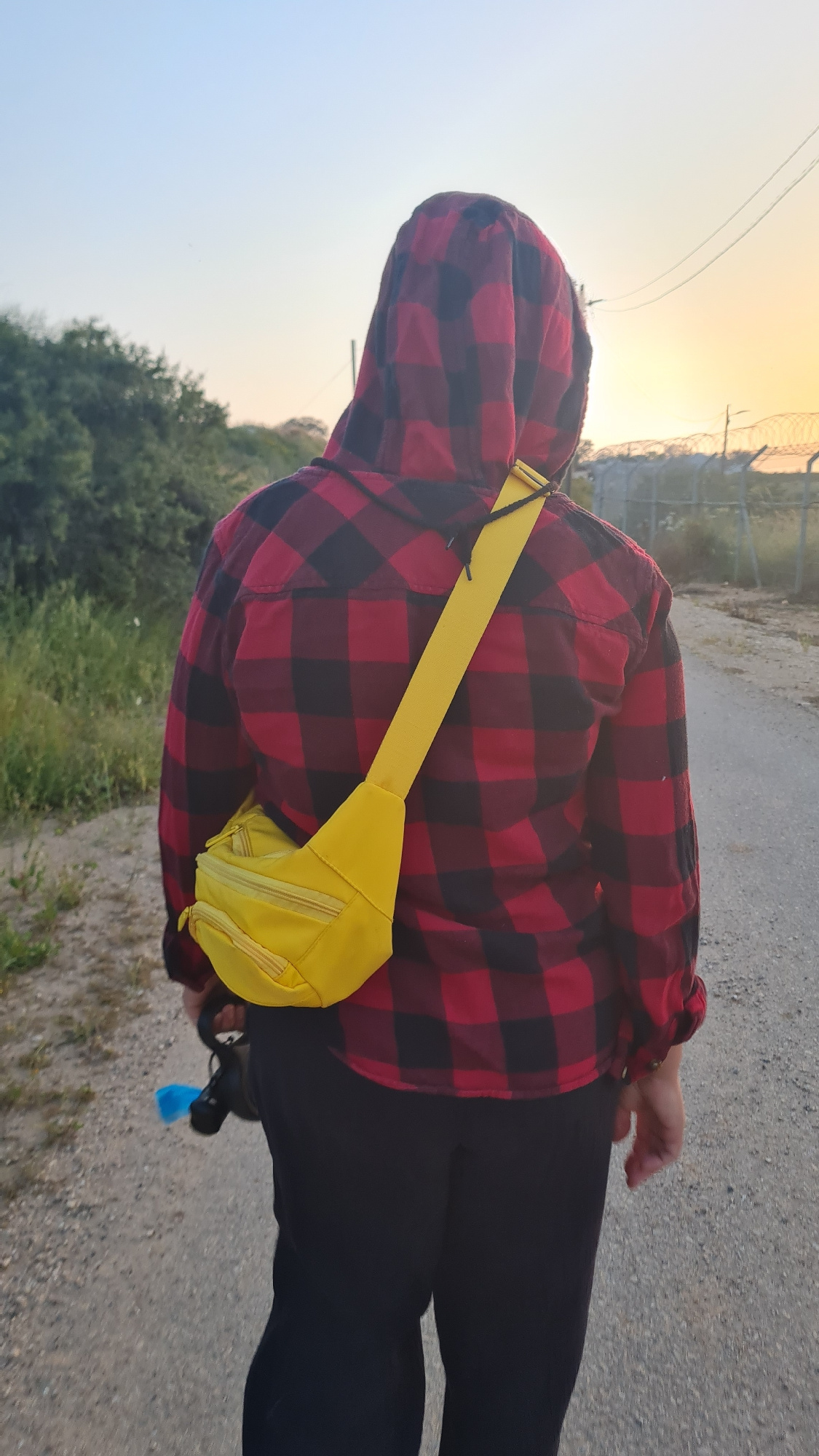 A person wearing a red and black hooded flannel shirt, black pants, and a yellow fanny pack stands on a paved surface. The person's face is obscured by the hood. In the background, there are trees, a…read more