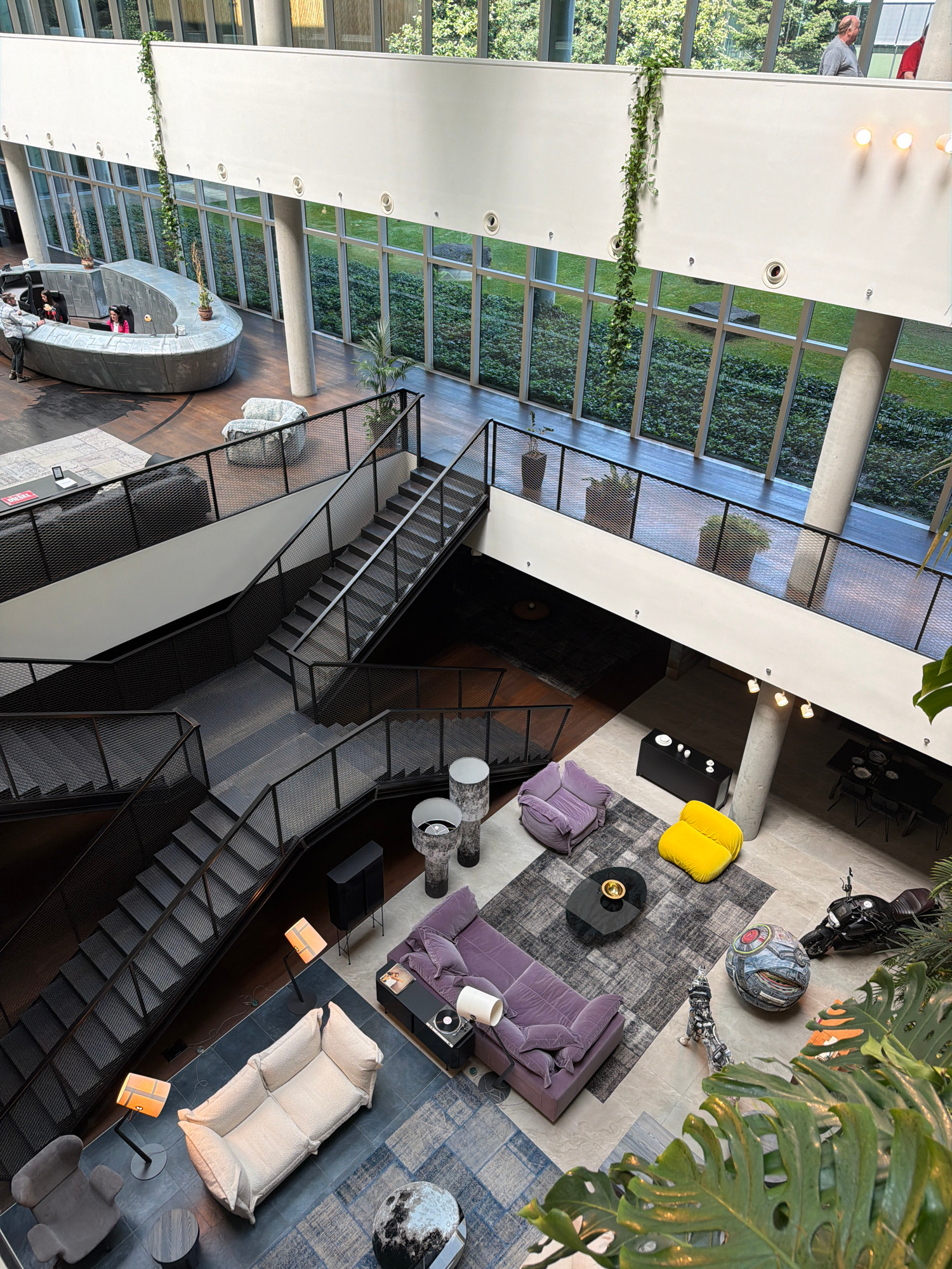 This is an overhead, tilted view of a modern multi-level indoor space, likely an atrium or a large lobby, in Mirabella, Italy. The interior features contemporary design elements including prominent bl…read more