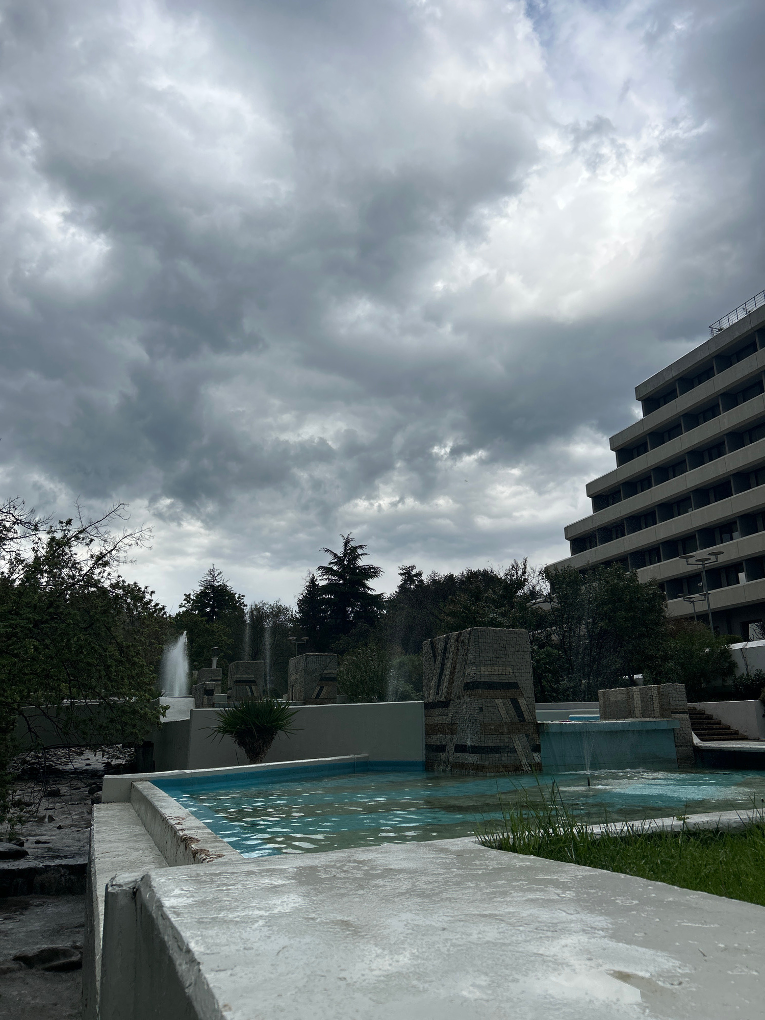 The image depicts a cityscape in Sandanski, Bulgaria, under a cloudy sky. A tall, gray building with a repetitive horizontal pattern dominates the upper left of the frame. Adjacent to the building is…read more