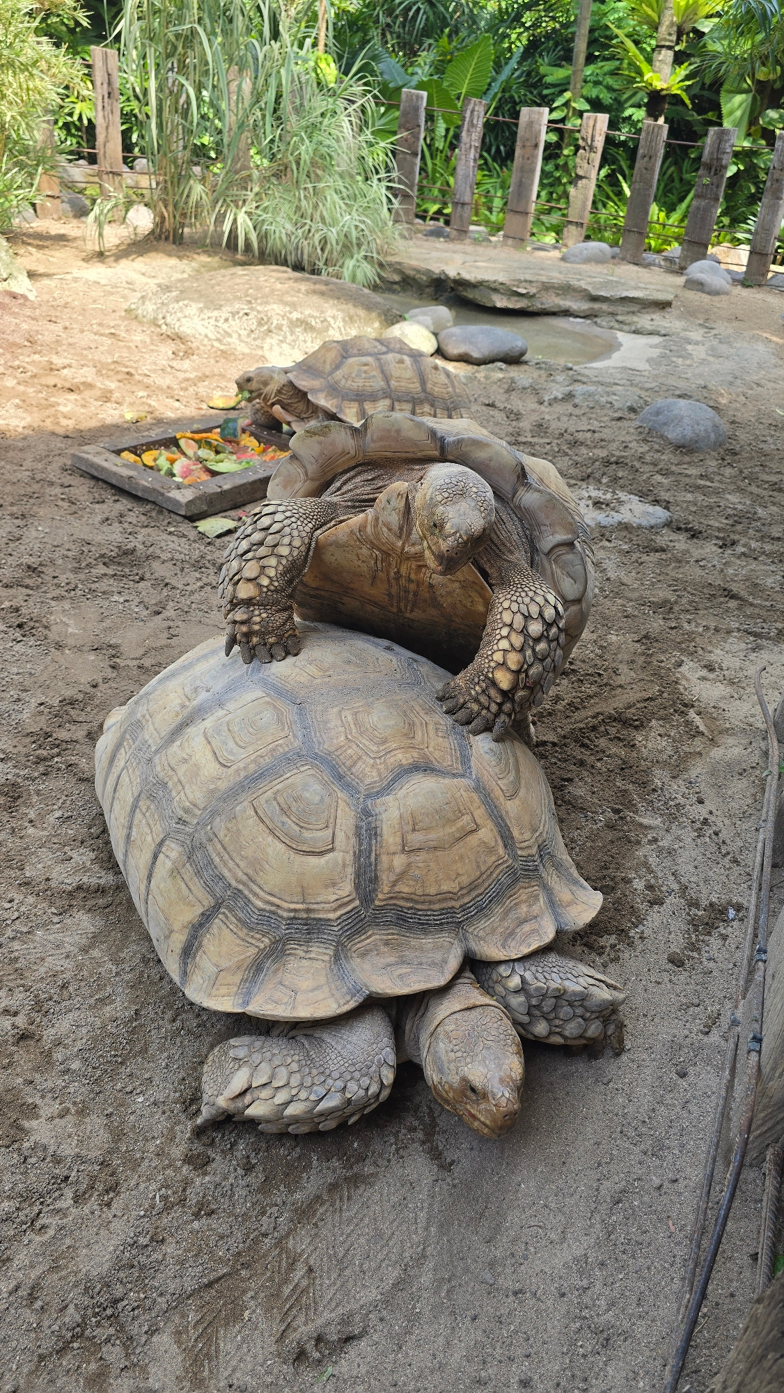 In Celuk, Indonesia, the scene depicts three tortoises on a sandy surface. One tortoise is partially atop another, its forelimbs resting on the larger tortoise's shell. A third tortoise is visible to…read more