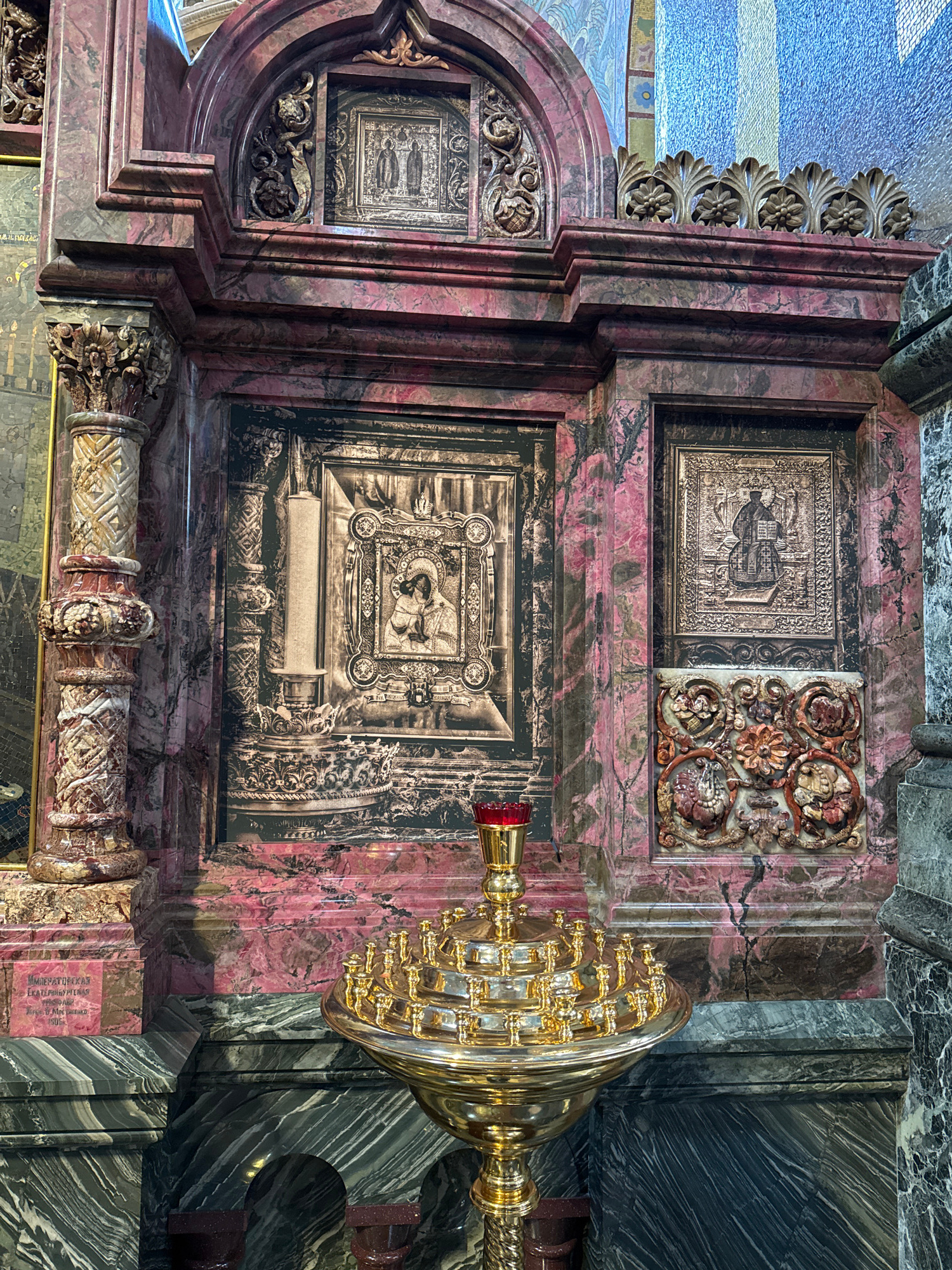 This is a close-up shot of ornate interior architectural details within a religious setting, potentially a church or cathedral. The location is Saint Petersburg, Russia. The architectural details fea…read more