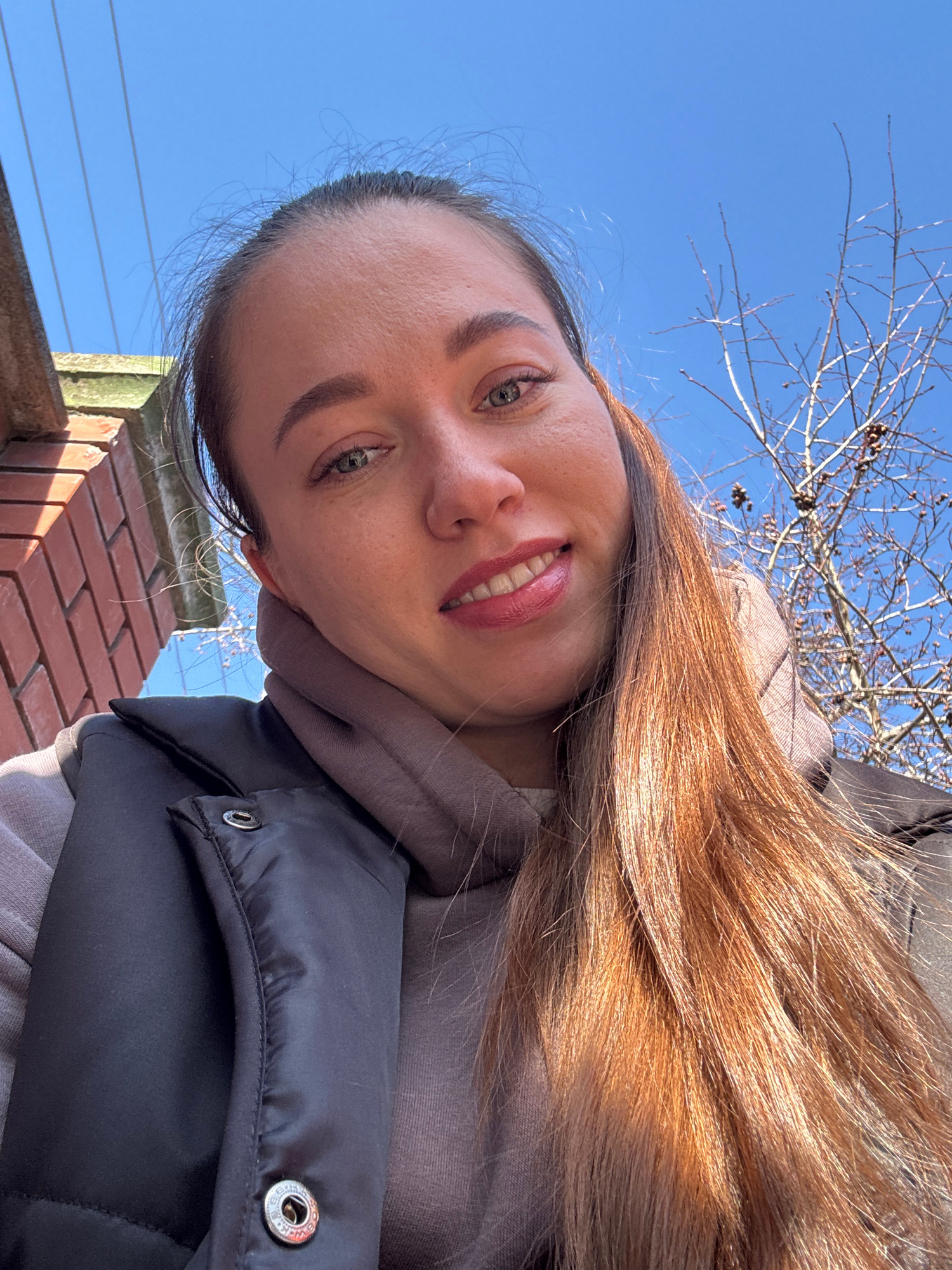 A female individual is depicted in a low-angle selfie, positioned outdoors in Ферма, Russia. She has long, reddish-brown hair, light-colored eyes, and a light complexion, exhibiting a closed-mouth smi…read more