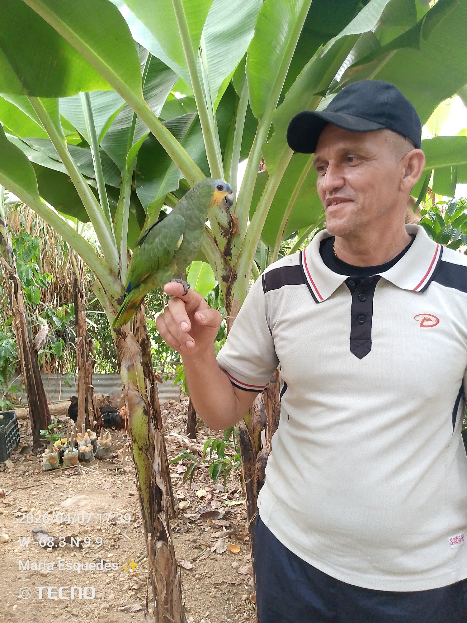 A man wearing a black baseball cap, a light-colored polo shirt, and dark pants is standing near a banana tree, holding out his finger for a green parrot to perch on. The location is the city of Tinaqu…read more