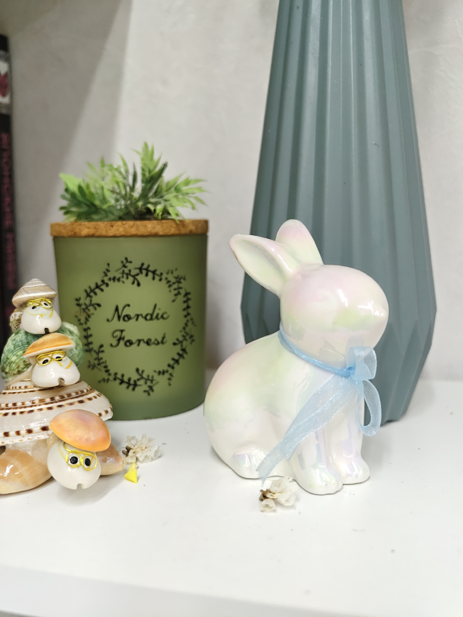 The image presents a still life arrangement featuring decorative objects on a white surface. From left to right, a shell figurine with multiple characters, a green candle holder labeled "Nordic Forest…read more