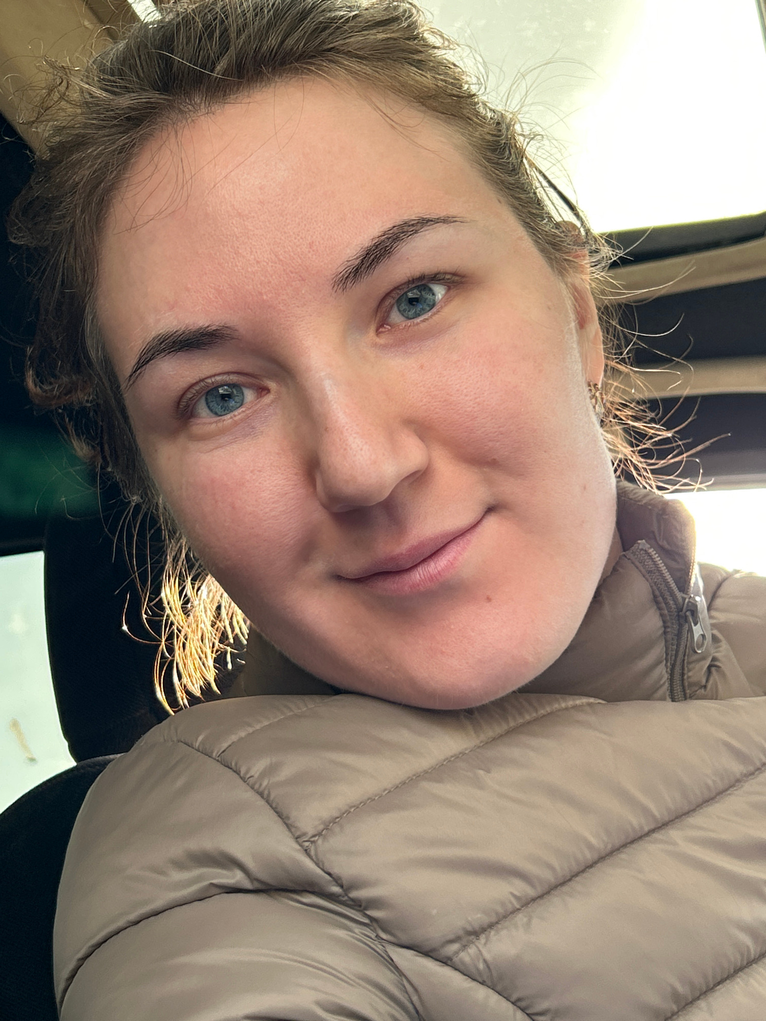 A close-up portrait features a young adult with light skin, striking blue eyes, and light brown, slightly wavy hair. The image is significantly tilted, presenting the subject's head at an oblique angl…read more