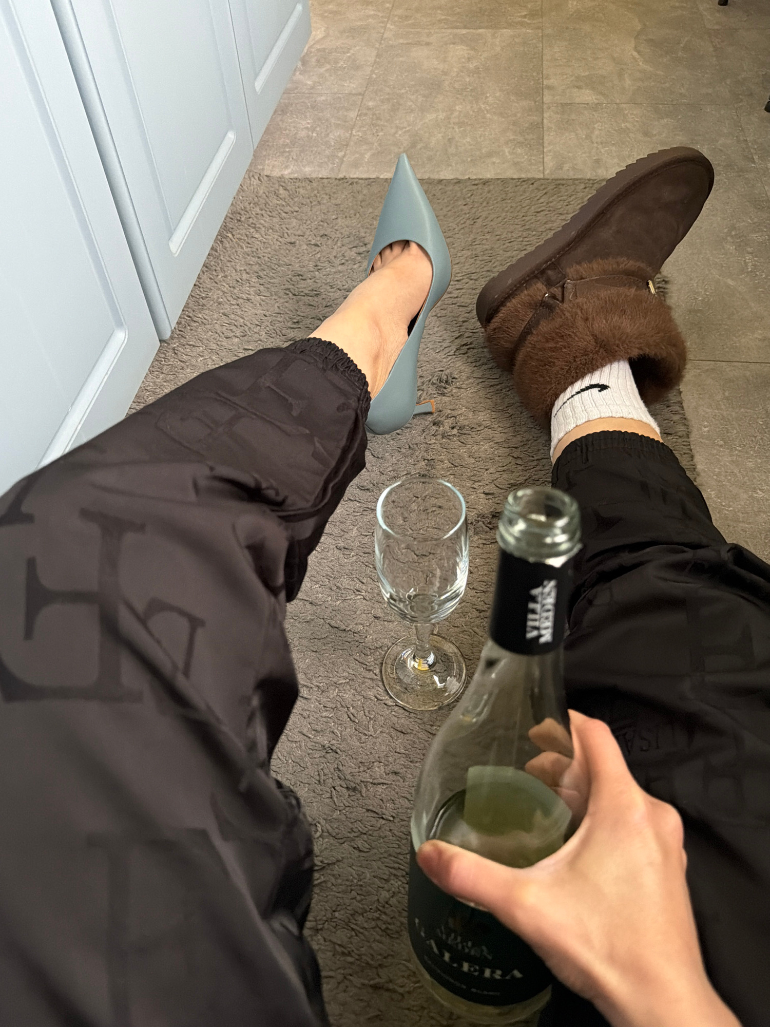 The image presents an indoor scene. A person is visible, dressed in black pants, one leg adorned with a brown Ugg boot and white sock, while the other wears a light blue high-heeled shoe. A hand is ca…read more