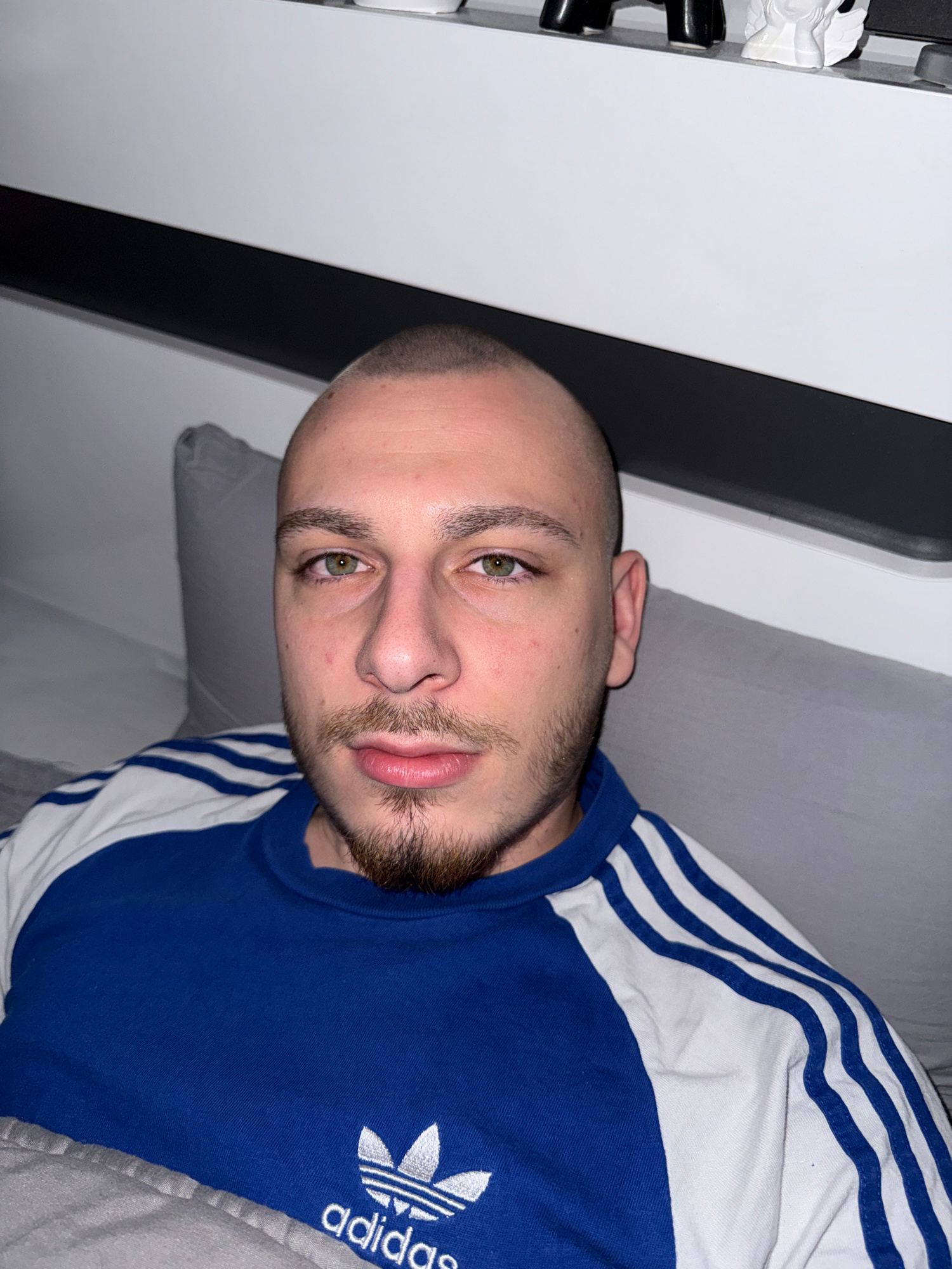A man with a shaved head, light skin, a short dark beard, and hazel eyes is lying on a gray surface, likely a bed. He is wearing a blue and white Adidas sweatshirt with three white stripes on the shou…read more