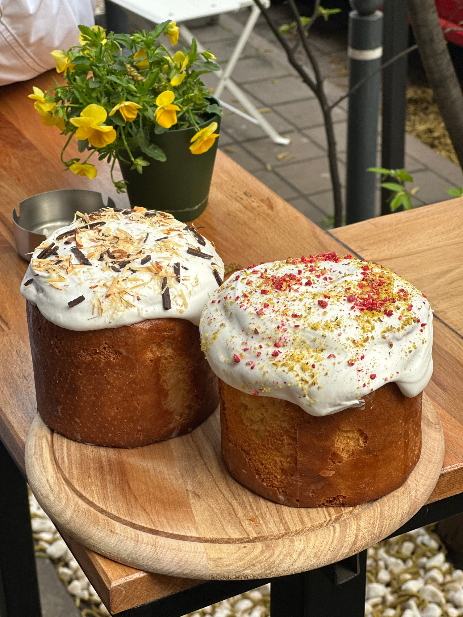 Here's a description of the image: Two sweet bread pastries, likely kulich, sit on a wooden cutting board. One is topped with white frosting and sprinkles of red and green. The other has white frosti…read more