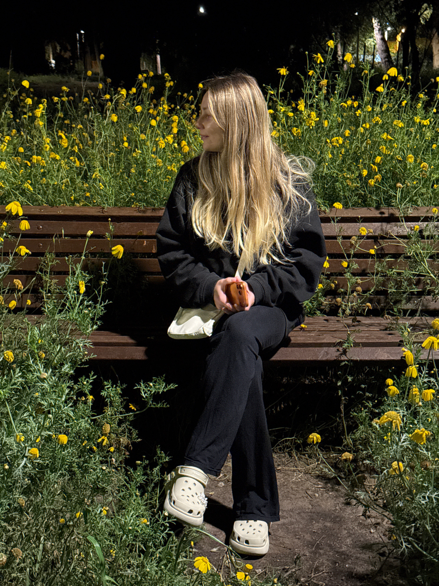 A young woman with long, blonde hair sits on a dark brown wooden bench in an outdoor setting at night. She wears a black hoodie and black pants, with light-colored Crocs on her feet. She is holding a…read more