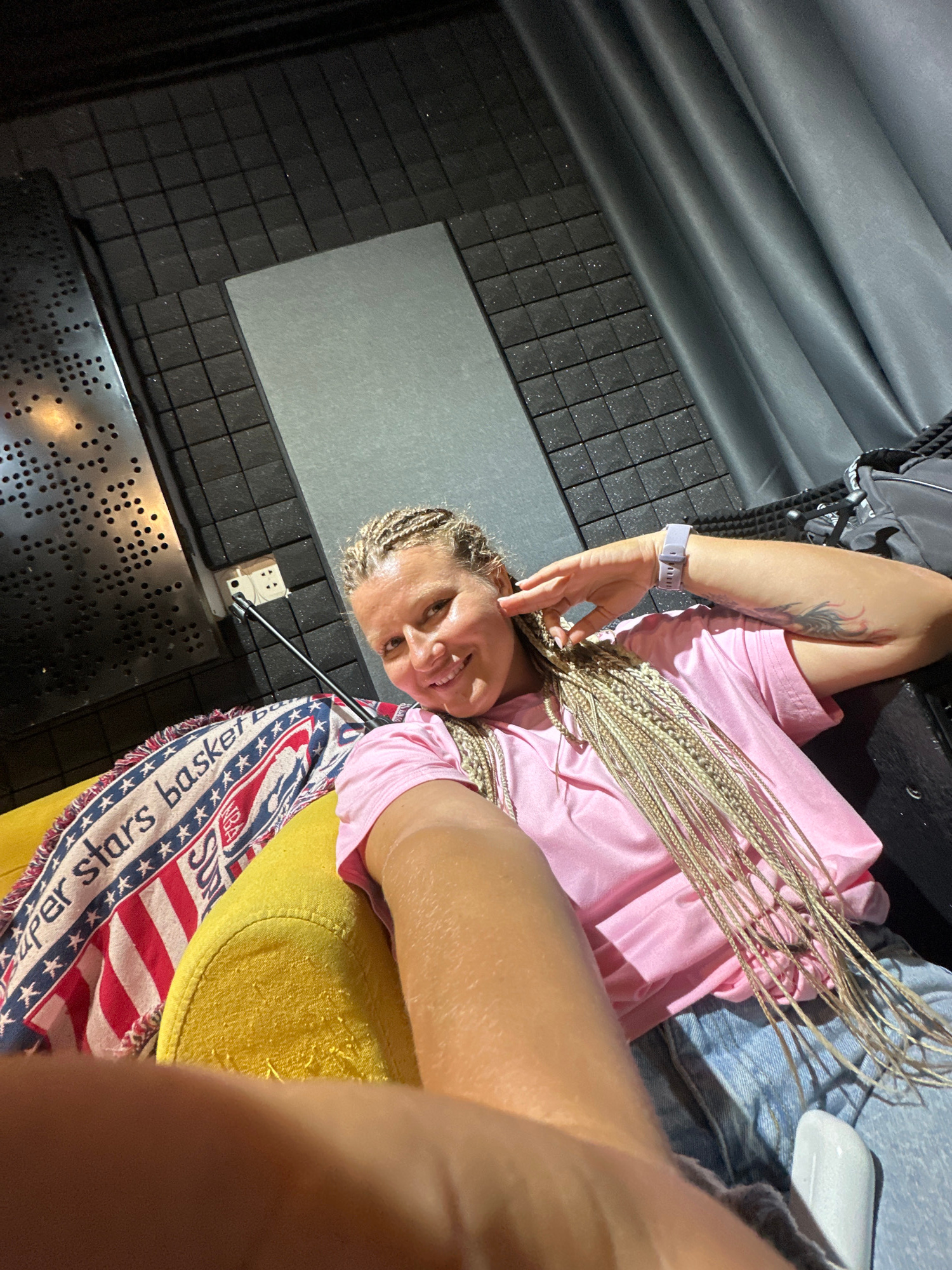 A woman with blonde braids, wearing a pink shirt and yellow pants, lies on a surface covered in dark, sound-dampening foam tiles. She is wrapped in a blanket featuring an American flag-inspired design…read more