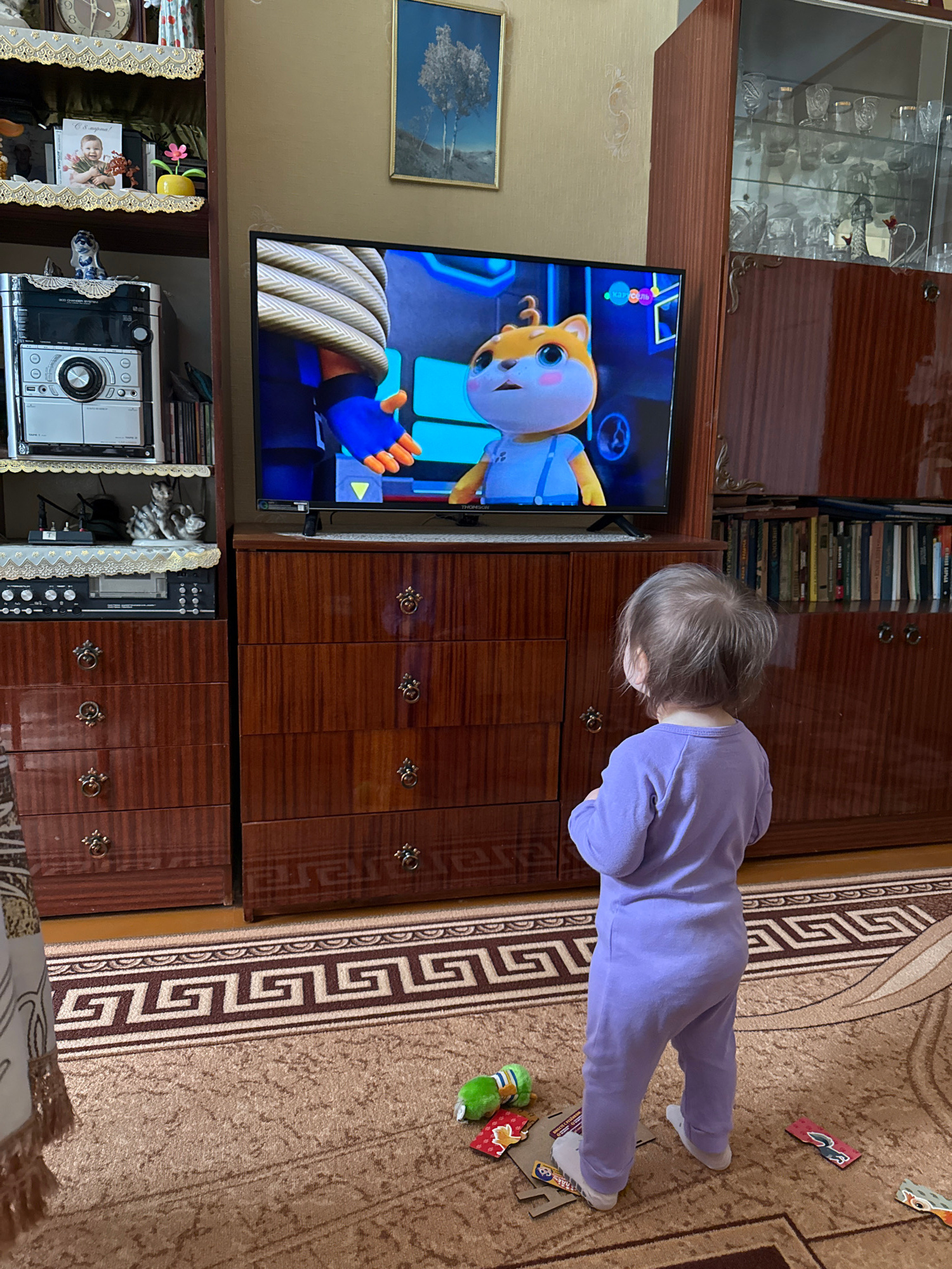 A child in a lavender jumpsuit is watching a cartoon on a television set. The TV is set inside a brown wooden cabinet. To the left of the TV, is a clear glass cabinet filled with glassware. There is a…read more