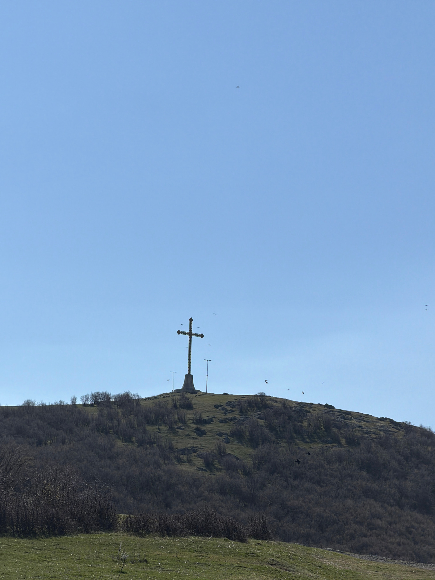 The image shows a large metal cross on a hilltop, presumably in or near Bata, Bulgaria, as the user specified. The cross is dark in color and sits atop a concrete or stone base. To the right of the cr…read more