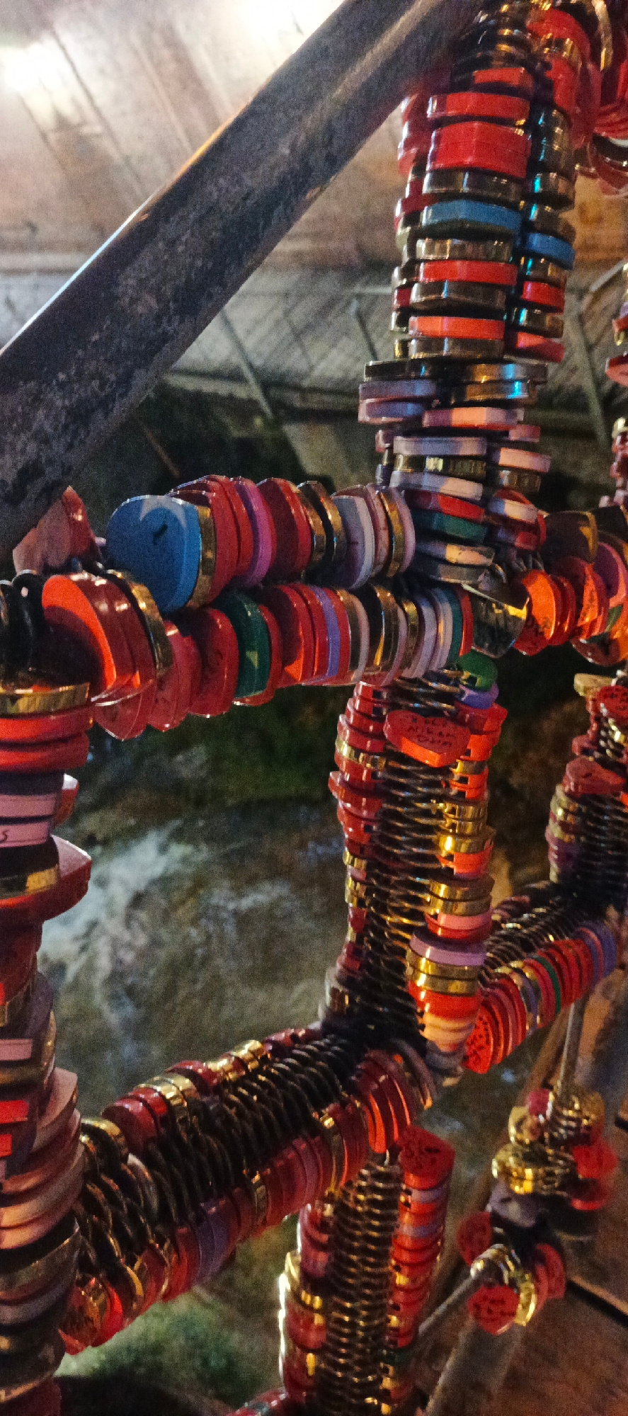 The image shows a section of a metal railing densely adorned with colorful, circular love locks. These locks, primarily red with gold accents, are attached to the railing, creating a layered effect. A…read more