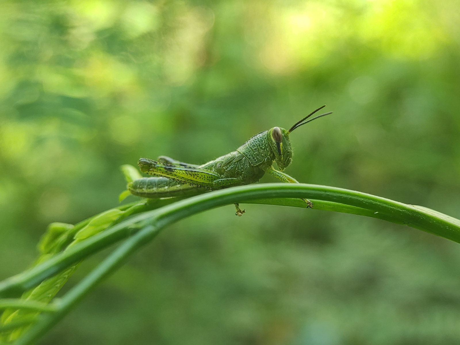 A green grasshopper is perched on a slender, curved green plant stem in an outdoor setting. The background is a blurred green, suggesting foliage and possibly a garden or natural environment. The gras…read more