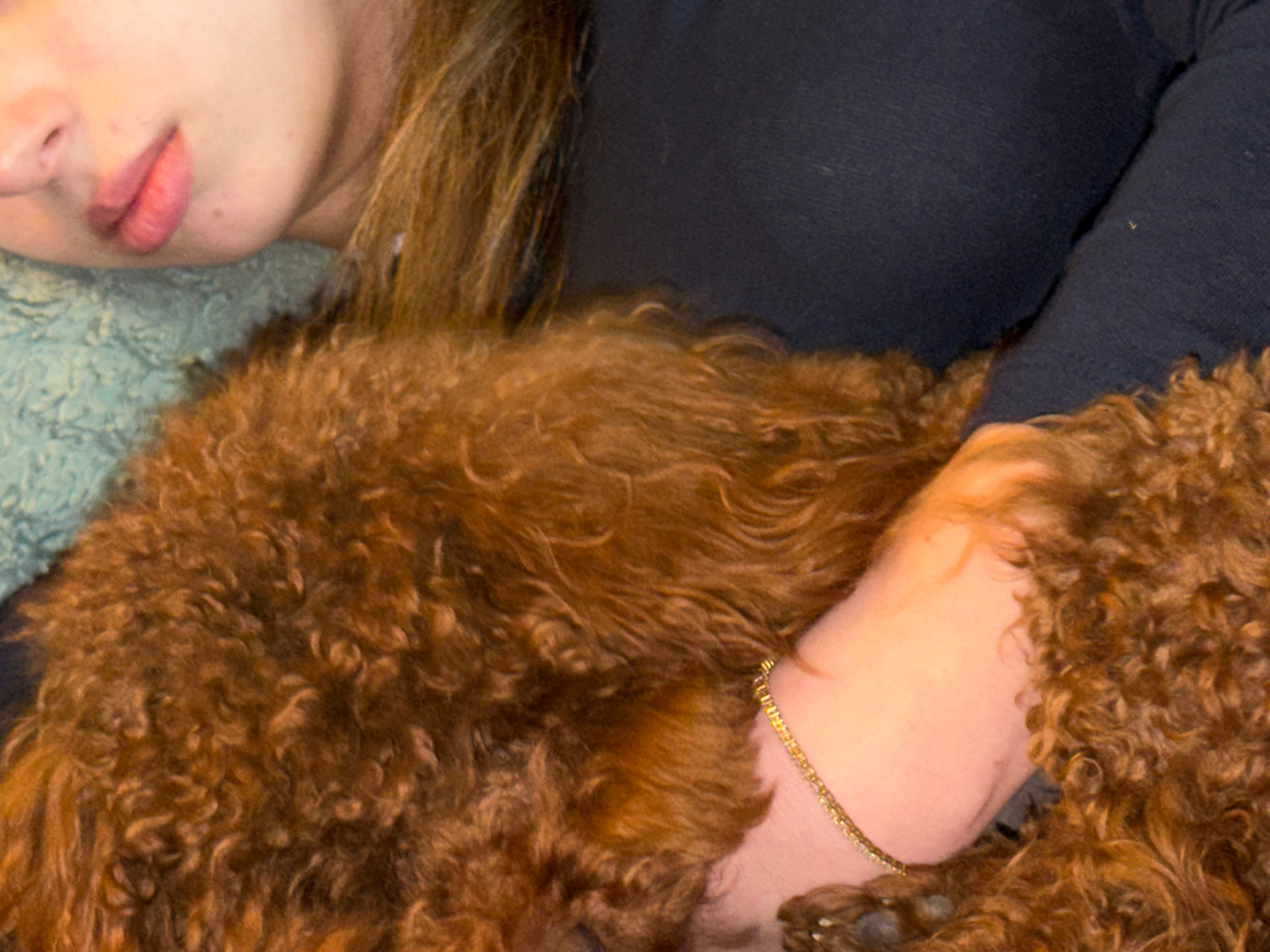 A person is cuddling with a brown, curly-haired dog. The person is lying on what appears to be a textured, blue-green surface, possibly a blanket or cushion. The person is wearing a dark-colored, long…read more