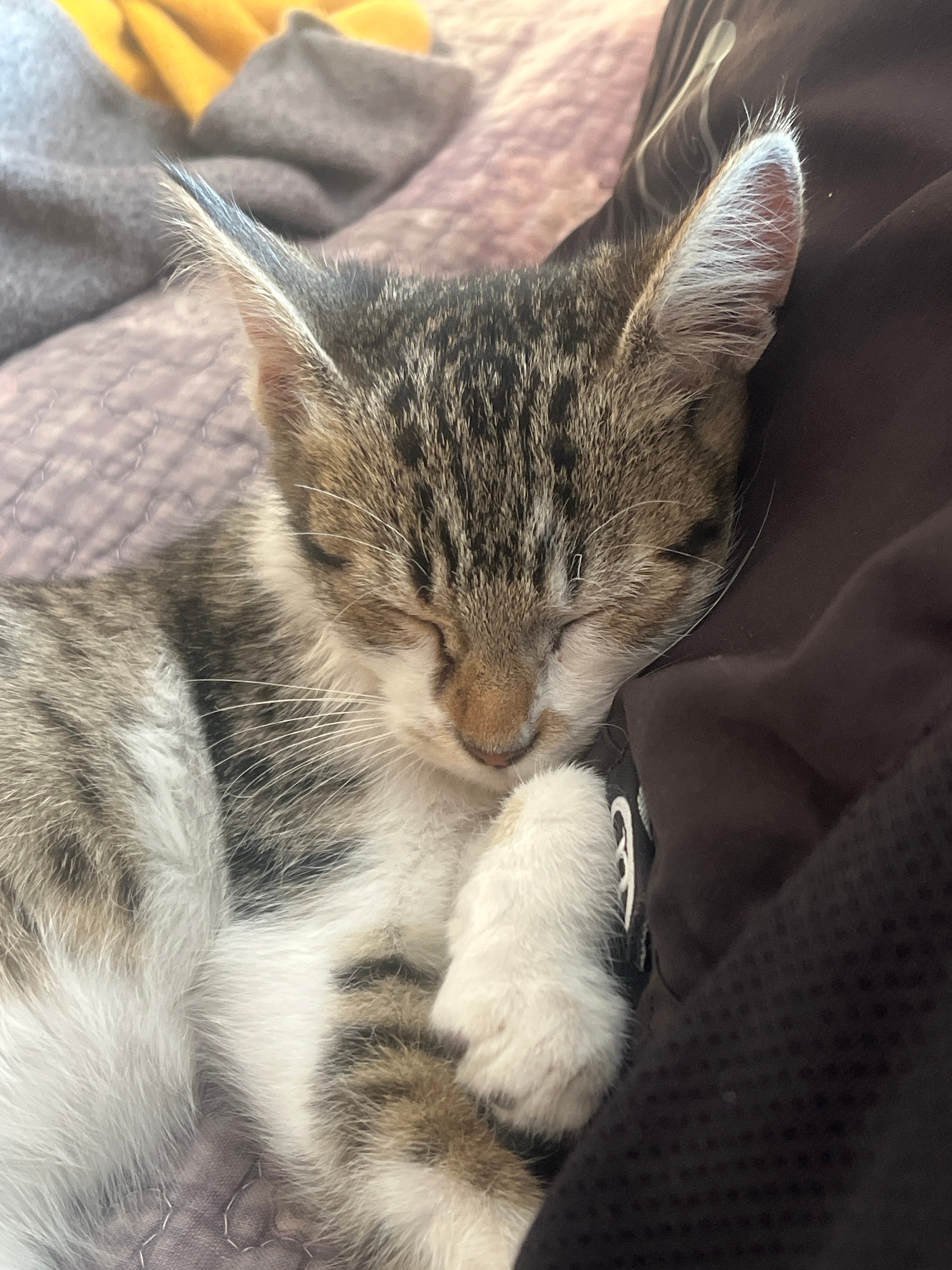 A close-up, high-angle shot shows a sleeping tabby kitten lying on what appears to be a bed or a couch. The kitten's face, with eyes closed and paws curled up near its head, dominates the frame. The f…read more
