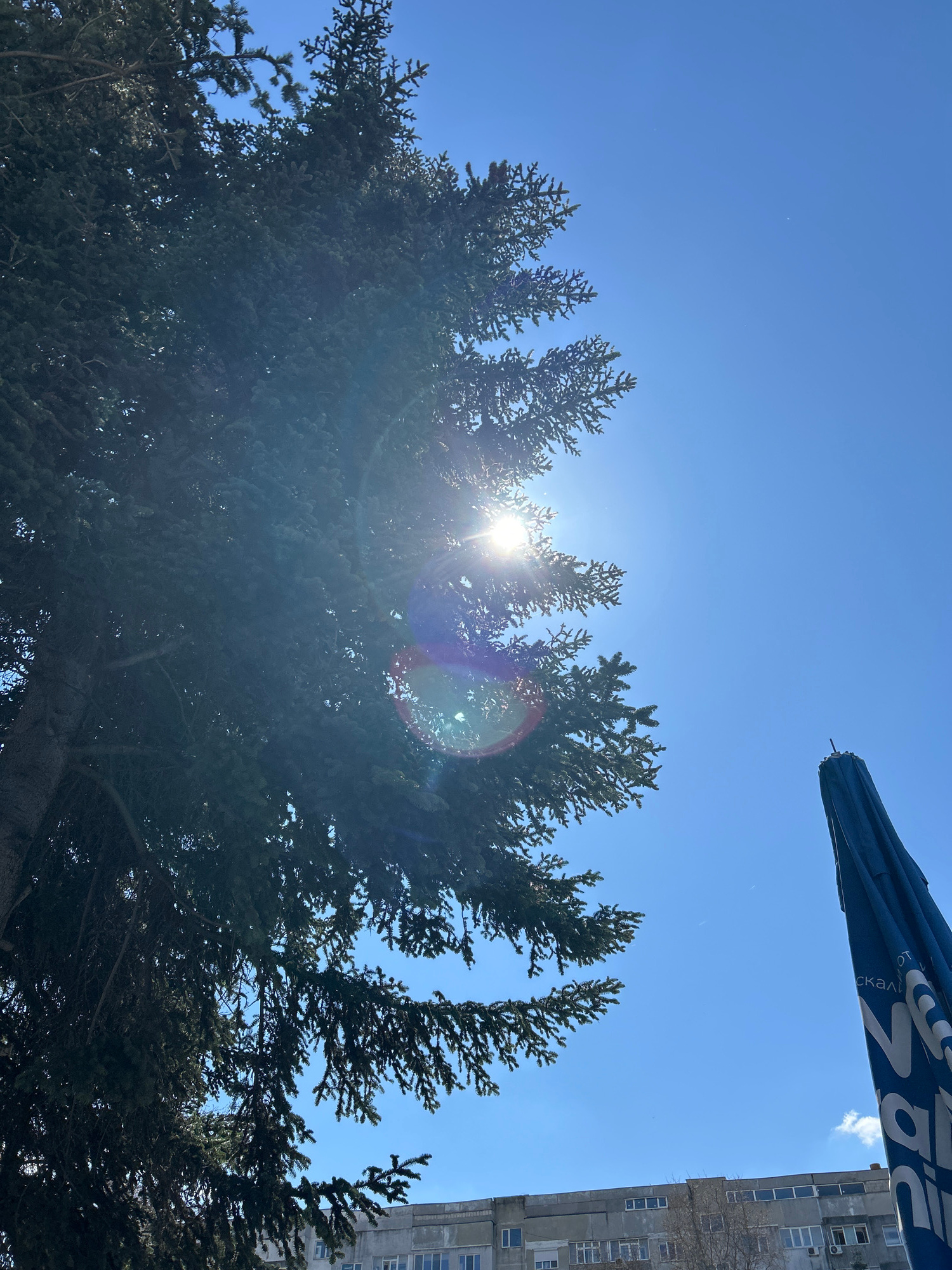 The image captures a view looking up at a bright, sunny sky partially obscured by a large, green coniferous tree. The sun is positioned behind the tree's branches, creating a lens flare effect. A port…read more