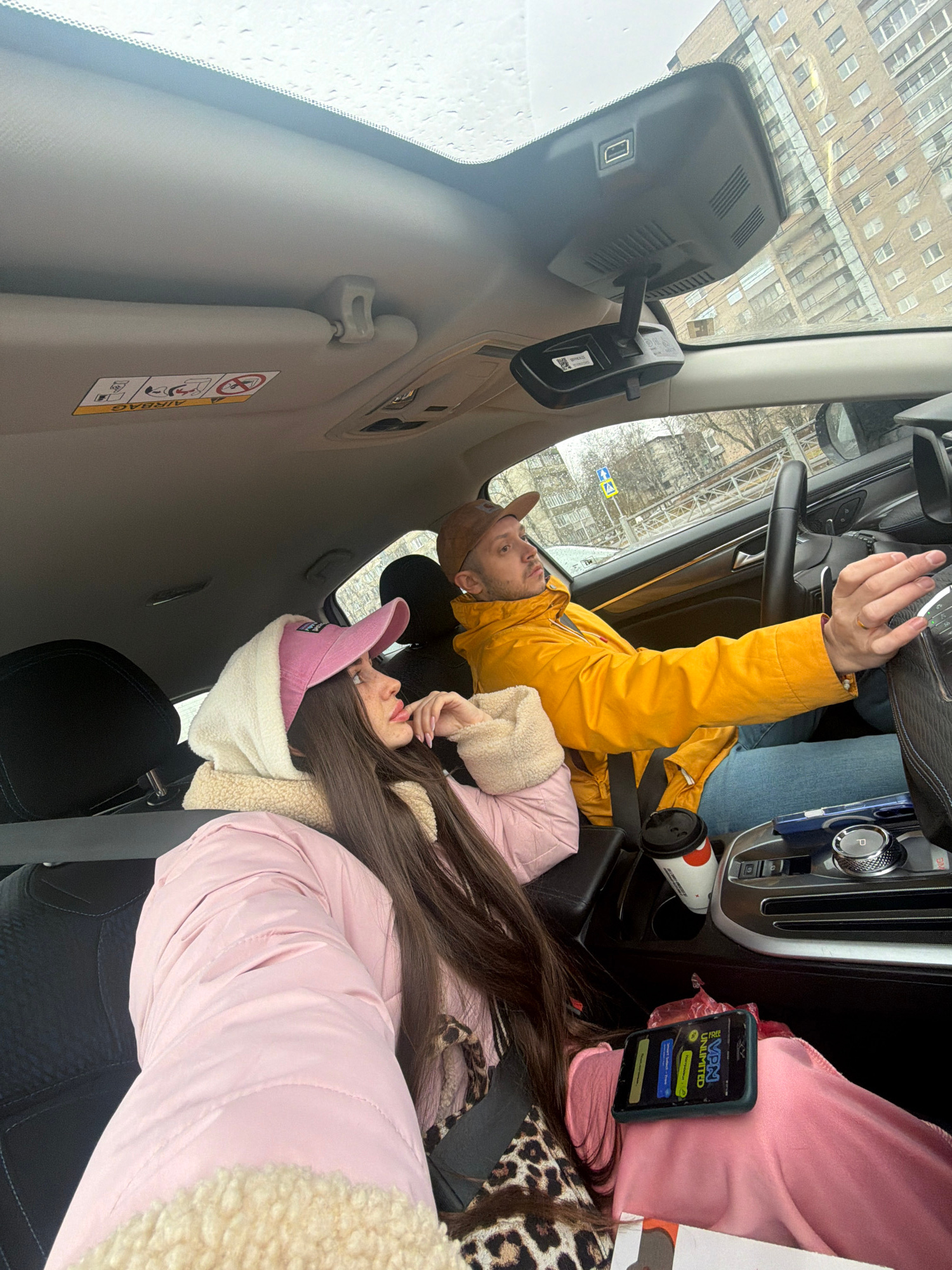 A photo taken in the front of a car in Saint Petersburg, Russia, shows two people lying down. A man wearing a yellow jacket and brown hat is sitting in the driver's seat. A woman is lying in the passe…read more